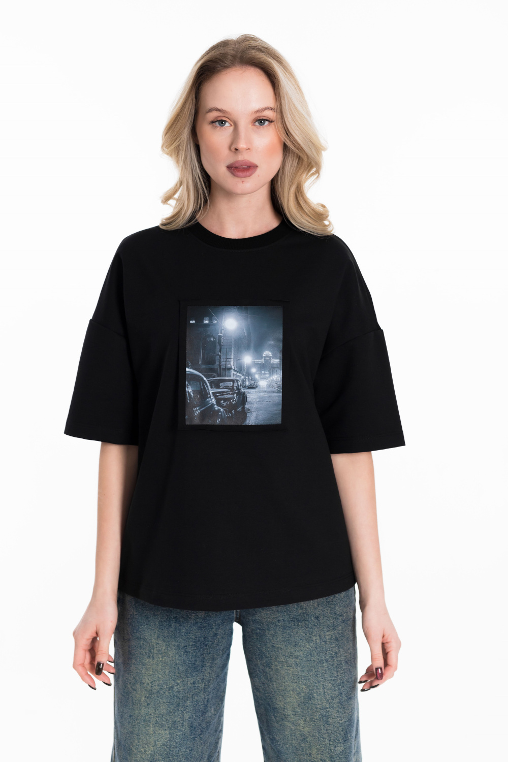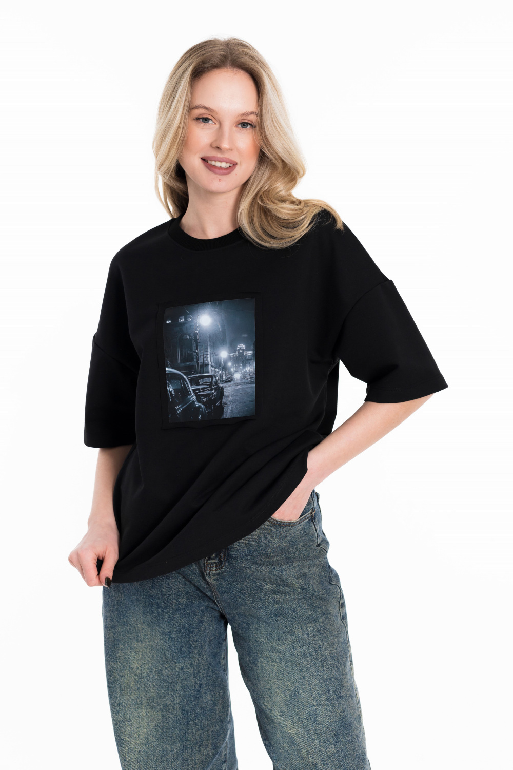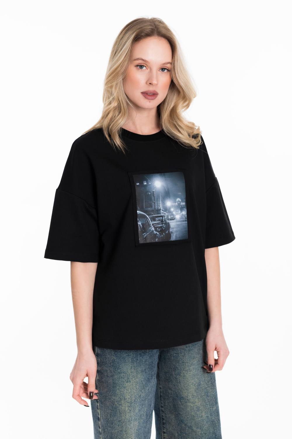 Женская футболка в стиле оверсайз с короткими спущенными рукавами. Футболка выполнена из футера двухнитки, круглый вырез горловины оформлен планкой. Крупный принт спереди.