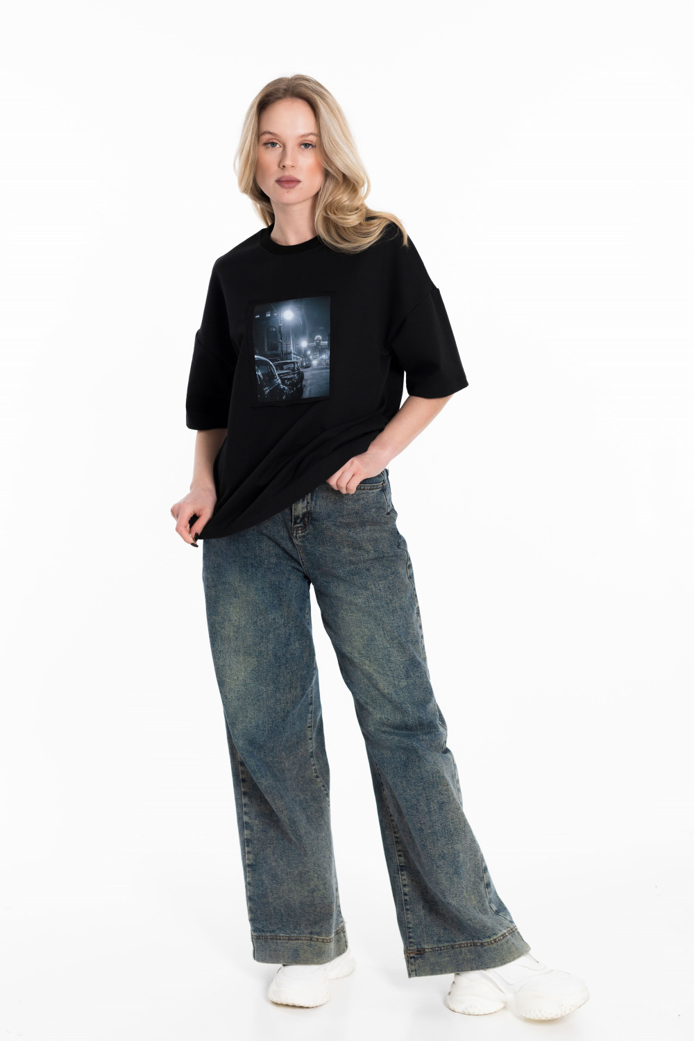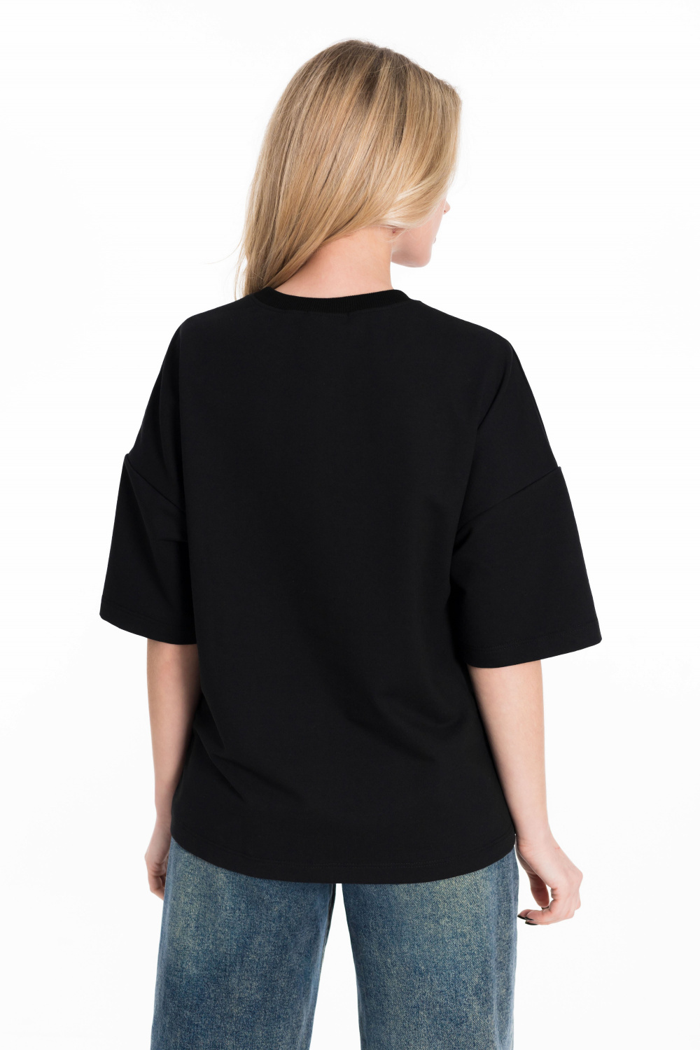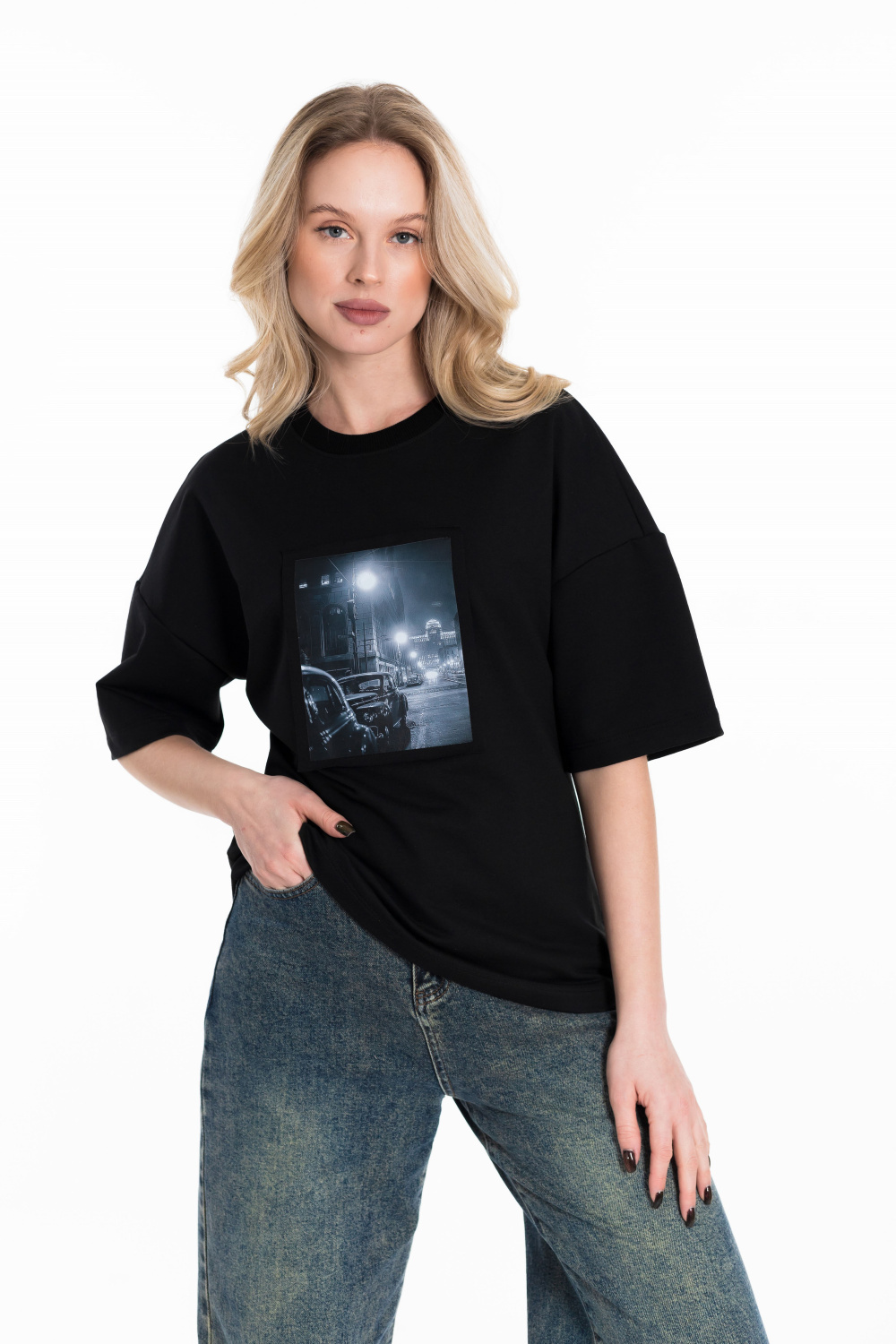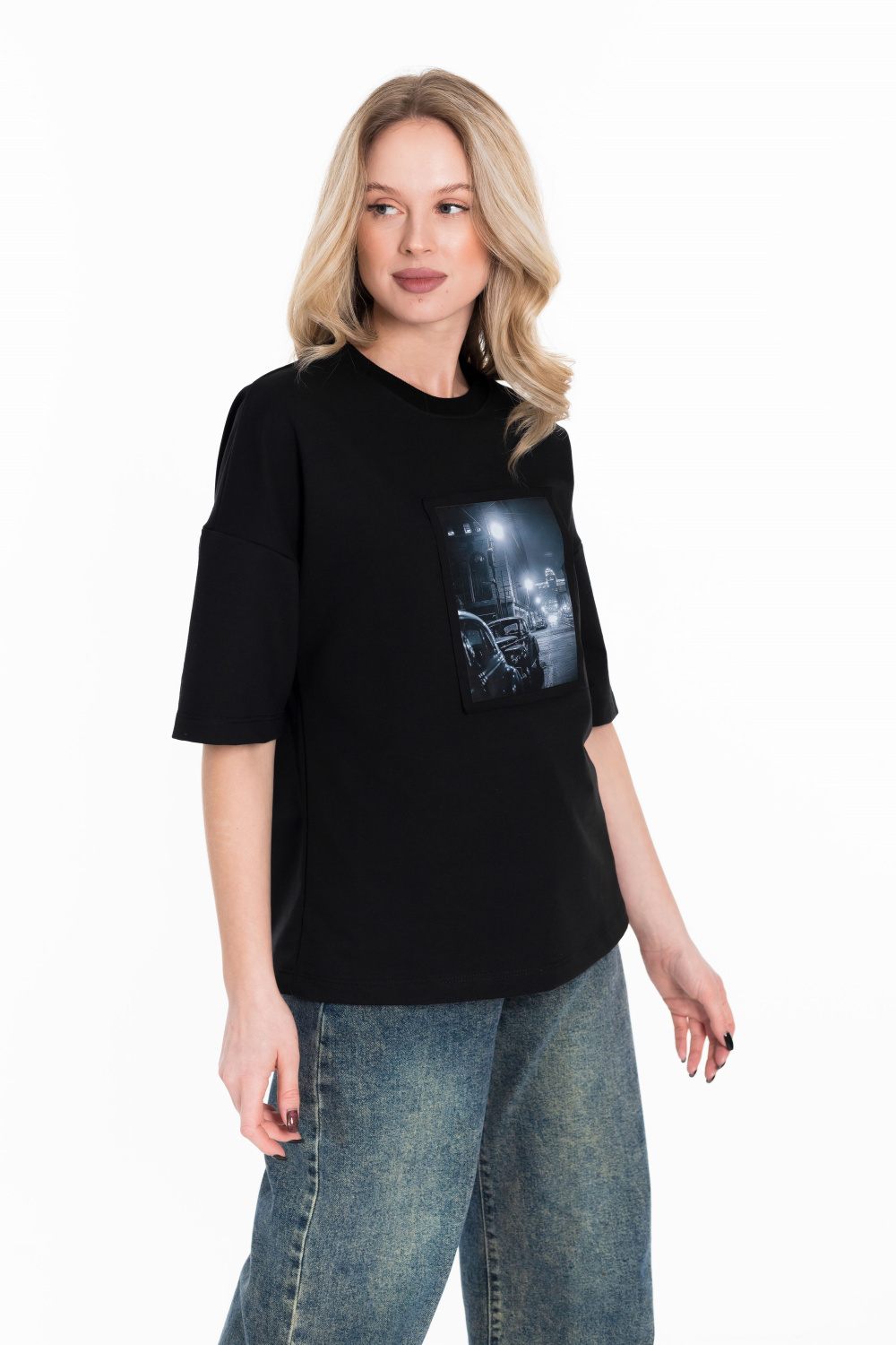 Женская футболка в стиле оверсайз с короткими спущенными рукавами. Футболка выполнена из футера двухнитки, круглый вырез горловины оформлен планкой. Крупный принт спереди.