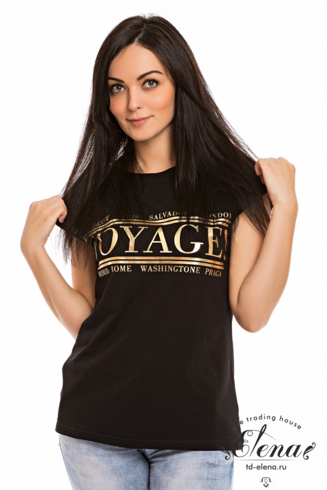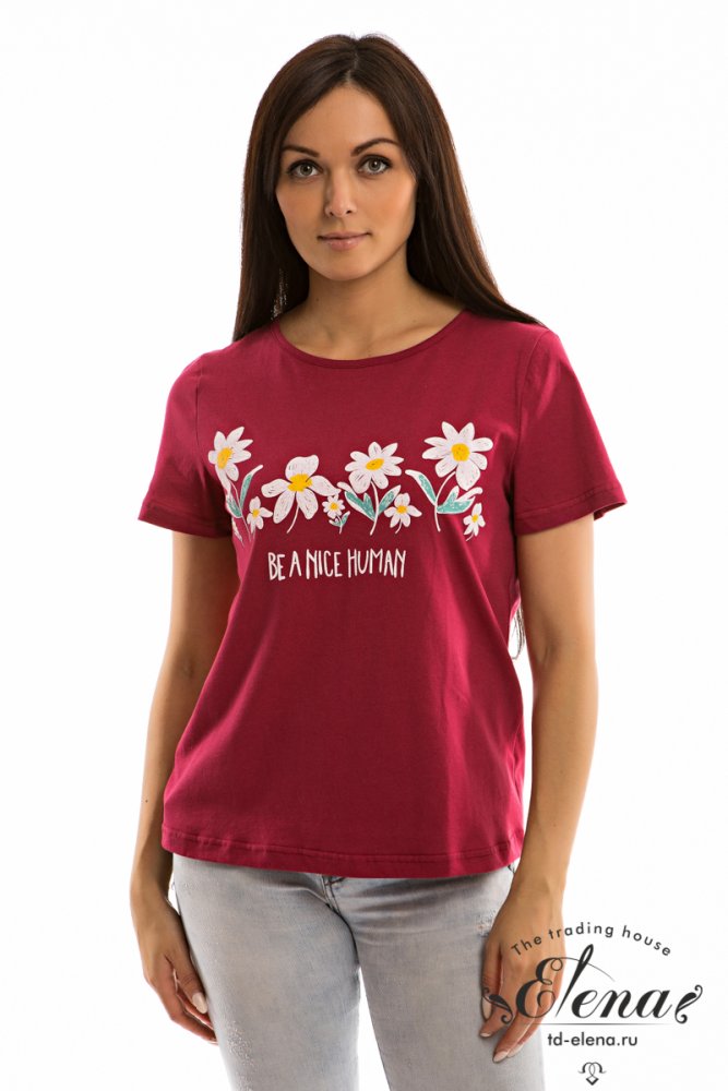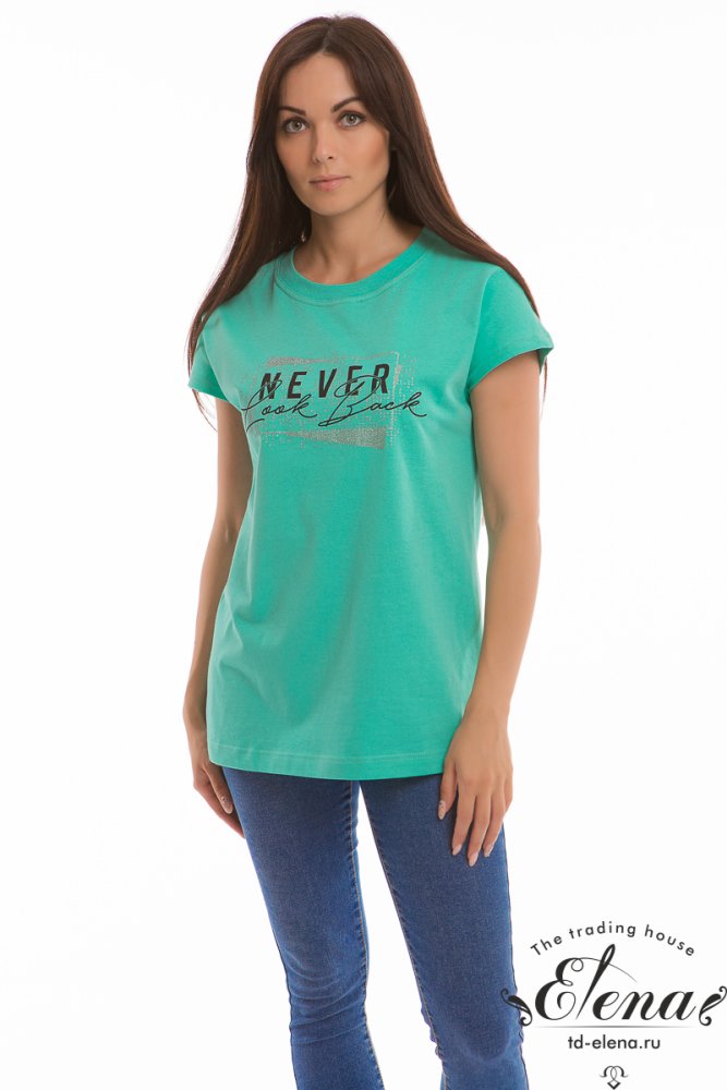 Женская футболка выполнена из однотонной кулирки с лайкрой. С коротким рукавом и круглым вырезом горловины, оформленным планкой. Спереди нанесён оригинальный принт.