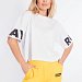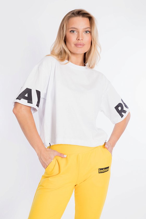 Футболка укороченная, оверсайз силуэта, выполнена из однотонной кулирки. С коротким рукавом и круглым вырезом горловины. По низу вставлен узкий шнур с фиксаторами. На рукавах нанесён принт.