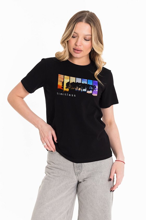 Женская футболка с принтом спереди изготовлена из хлопкового полотна с добавлением лайкры. Футболка с коротким втачным рукавом и круглым вырезом горловины, что придает ей классический стильный вид. Такая модель футболки отлично сочетается с джинсами, брюками или юбкой. Изготовленная из натуральной ткани, футболка обеспечит комфорт в течение всего дня.