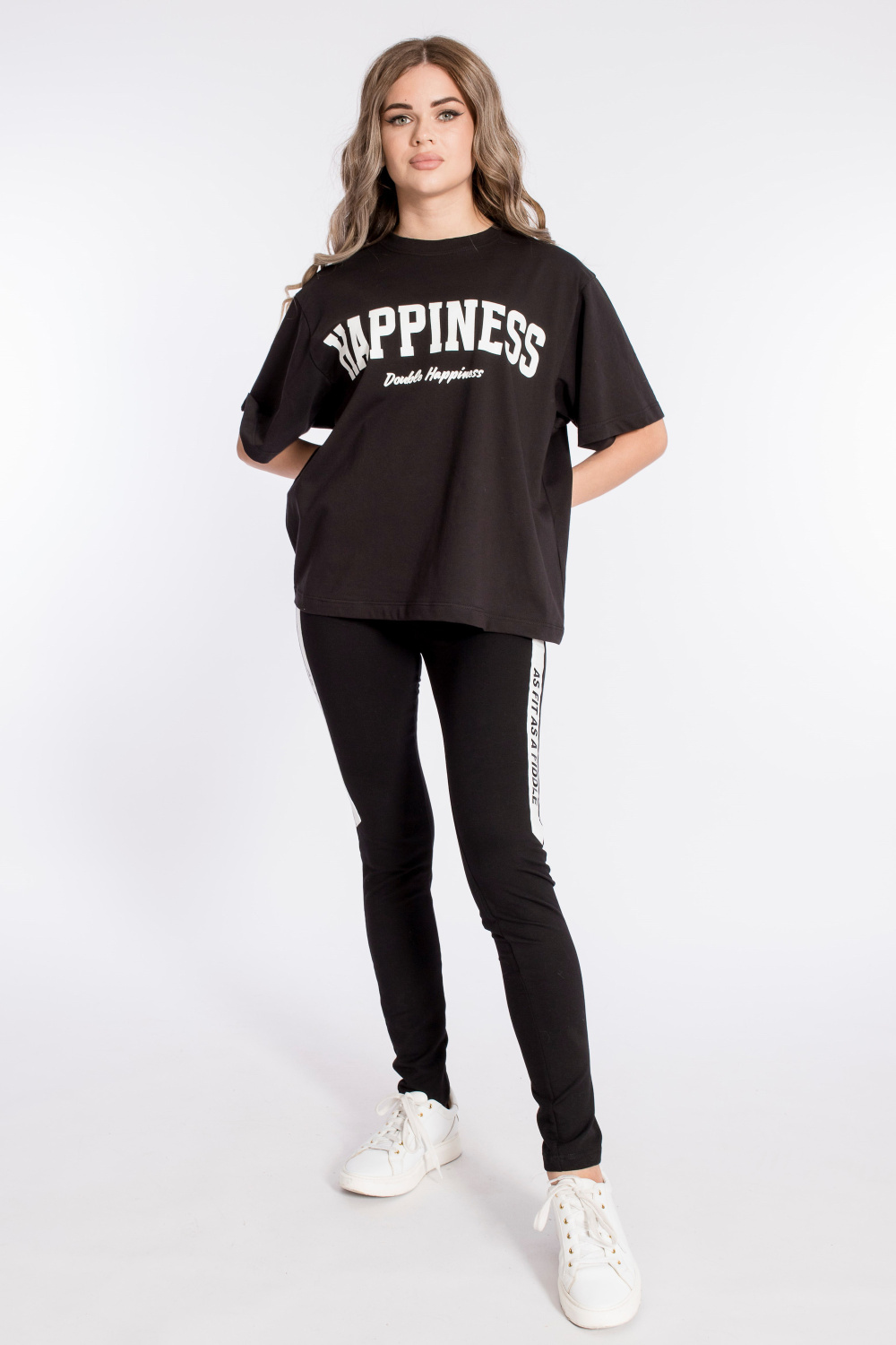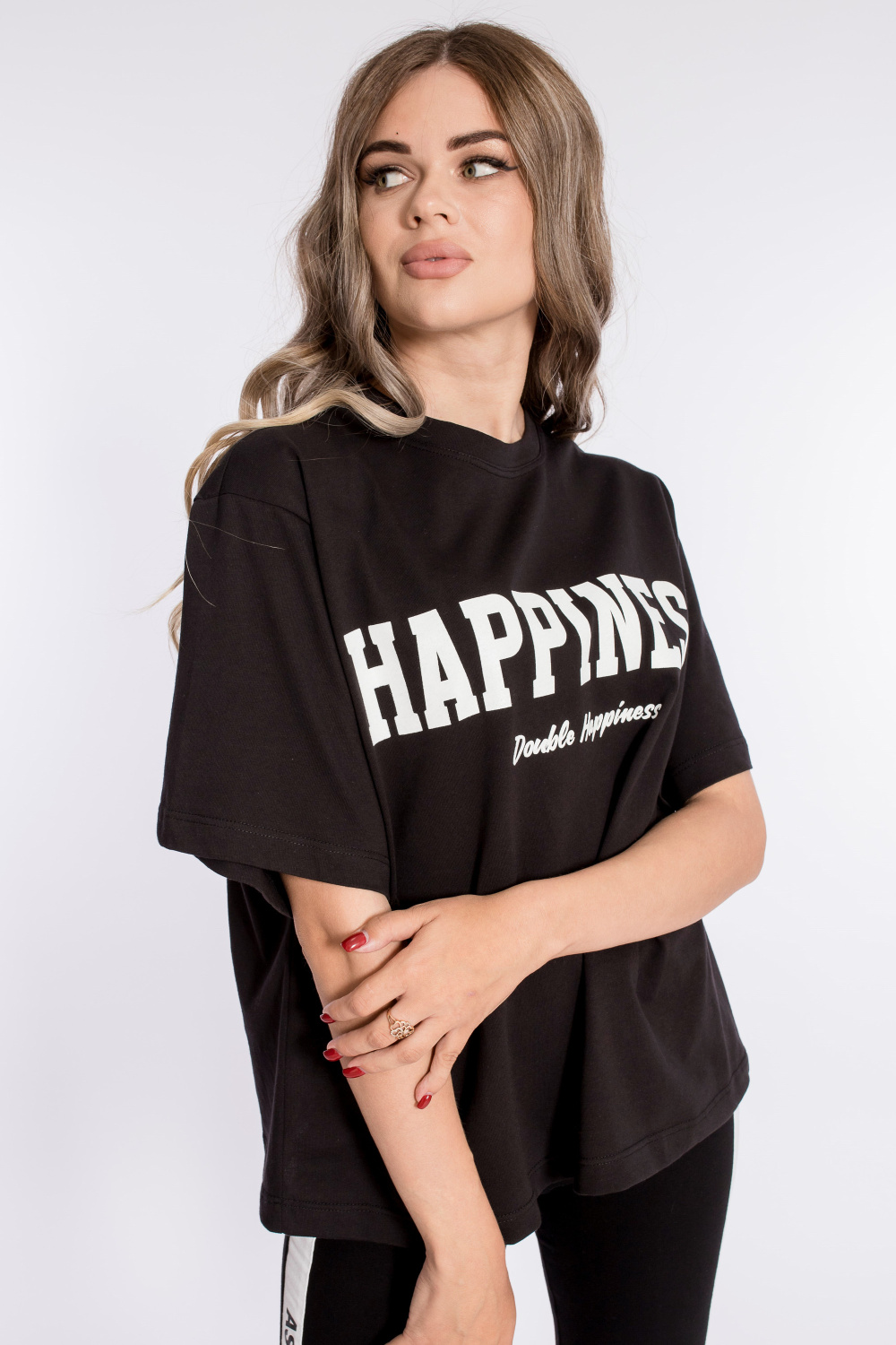 Футболка свободного силуэта выполнена из х/б полотна. Круглый вырез горловины оформлен планкой. Спереди нанесён принт.