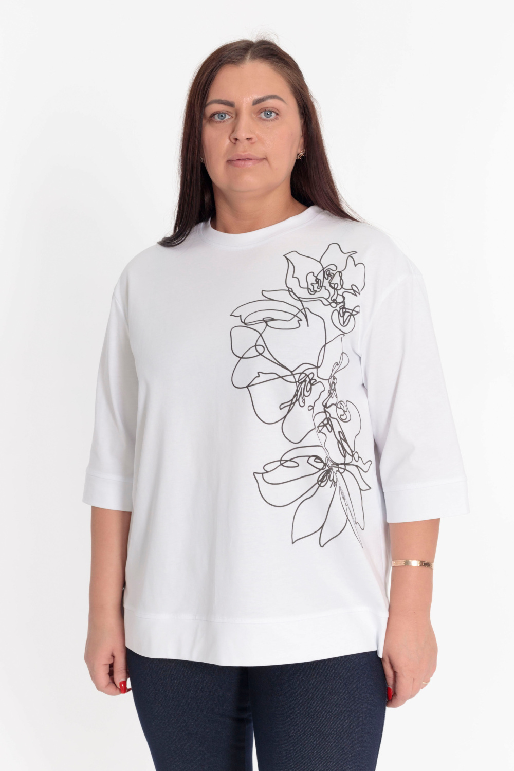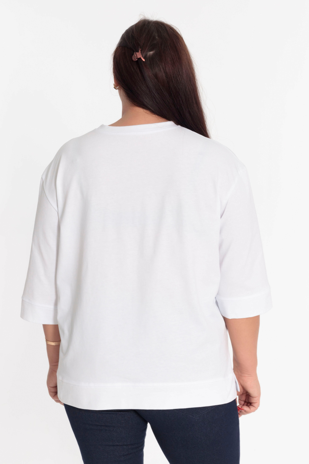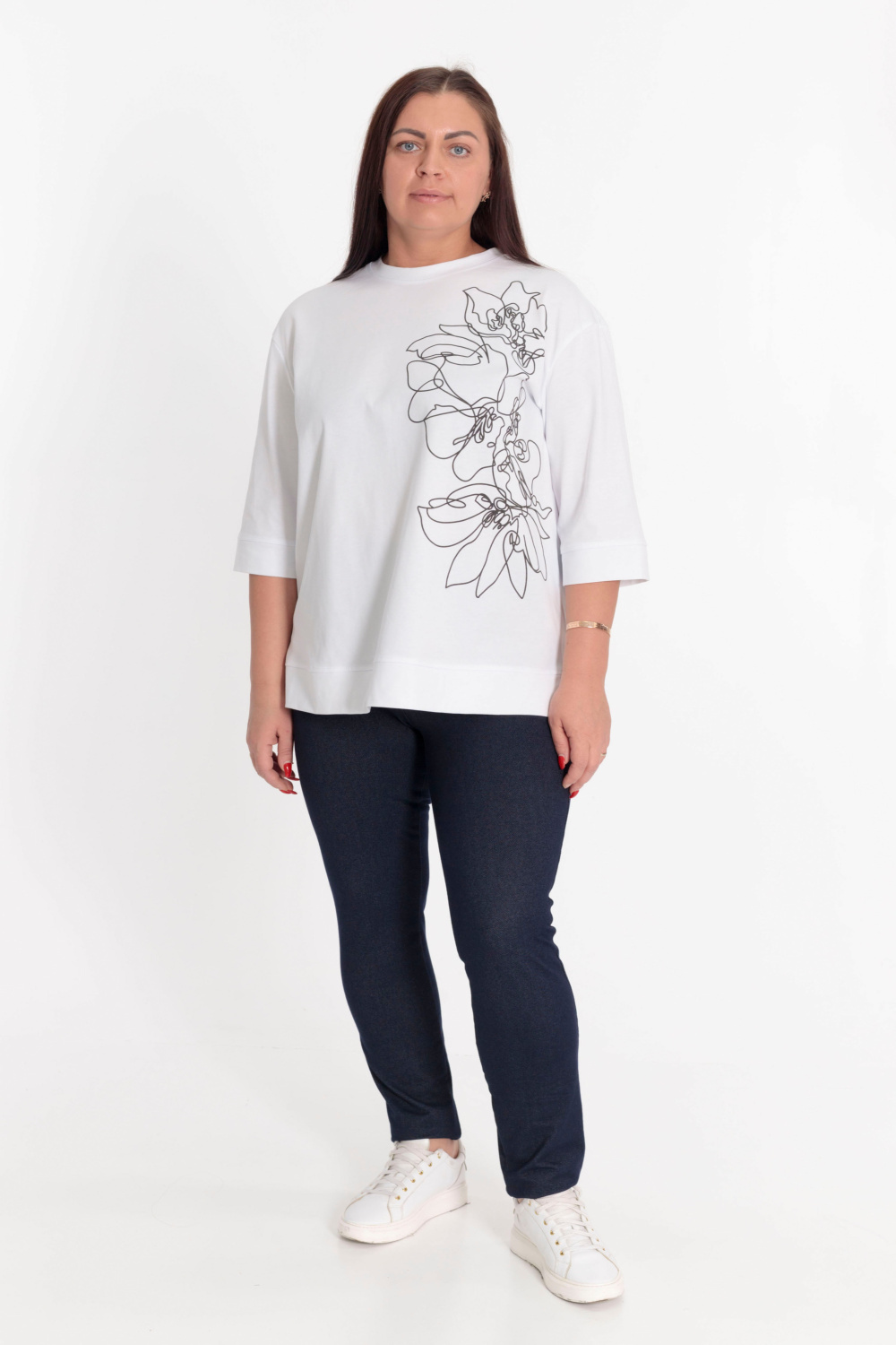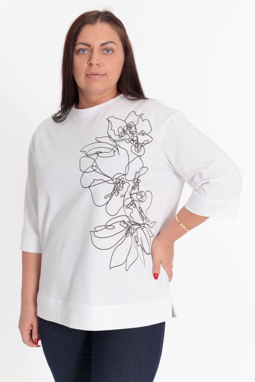 Футболка выполнена из однотонной кулирки. Рукава длиной 3/4, круглый вырез горловины оформлен планкой. Спереди расположен красивый принт. Внизу, в боковых швах декоративные разрезы.