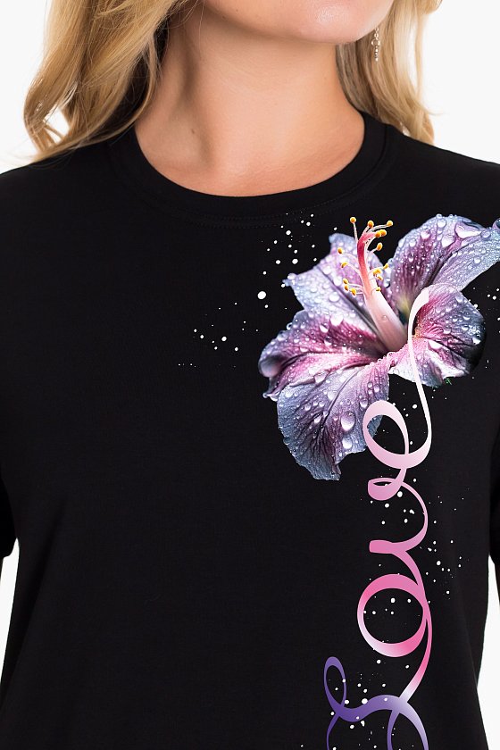 Женская футболка с принтом спереди изготовлена из хлопкового полотна с добавлением лайкры. Футболка с коротким втачным рукавом и круглым вырезом горловины, что придает ей классический стильный вид. Такая модель футболки отлично сочетается с джинсами, брюками или юбкой. Изготовленная из натуральной ткани, футболка обеспечит комфорт в течение всего дня.