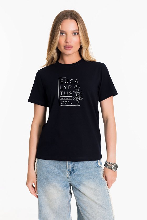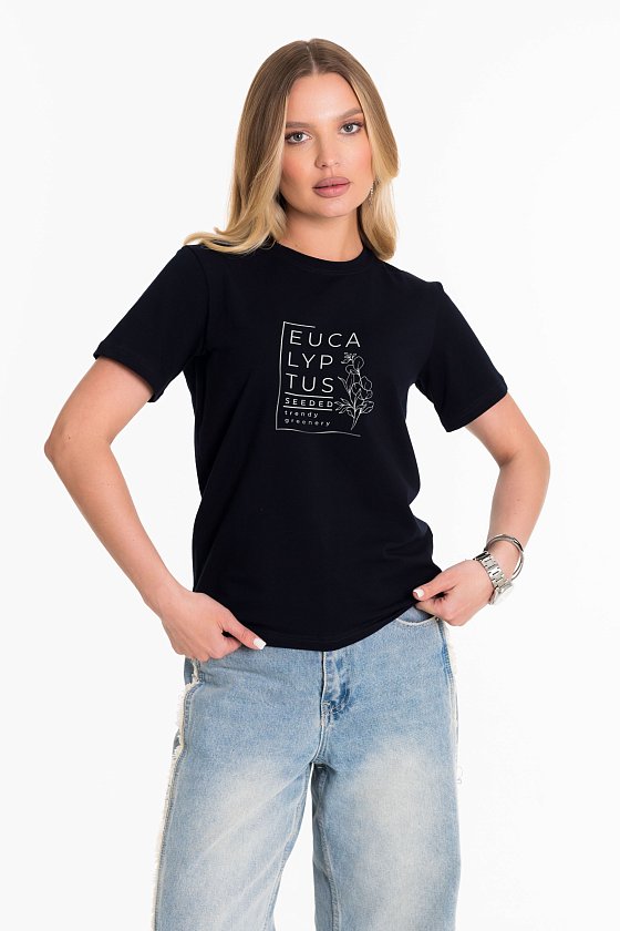 Женская футболка с принтом изготовлена из хлопкового полотна с добавлением лайкры - что обеспечивает комфорт и хорошую воздухопроницаемость. Футболка имеет короткий рукав и круглый вырез горловины, что придает ей классический стильный вид. Такая модель футболки отлично сочетается с джинсами, брюками или юбкой. Изготовленная из натуральной ткани, футболка обеспечит комфорт в течение всего дня.