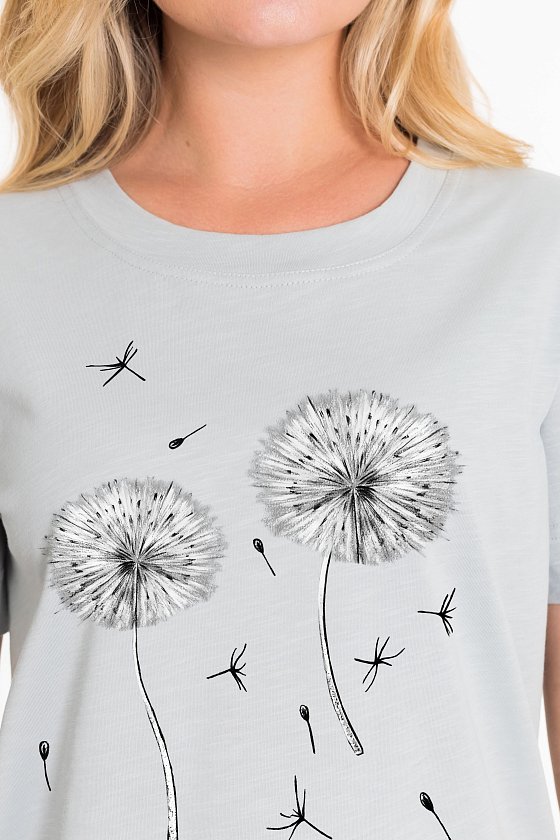 Женская футболка с принтом изготовлена из хлопкового полотна, что обеспечивает комфорт и хорошую воздухопроницаемость. Футболка имеет короткий рукав и круглый вырез горловины, что придает ей классический стильный вид. Такая модель футболки отлично сочетается с джинсами, брюками или юбкой. Изготовленная из натуральной ткани, футболка обеспечит комфорт в течение всего дня.