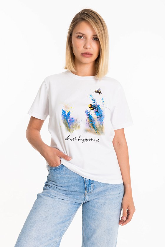 Женская футболка с принтом изготовлена из хлопкового полотна с добавлением лайкры - что обеспечивает комфорт и хорошую воздухопроницаемость. Футболка имеет короткий рукав и круглый вырез горловины, что придает ей классический стильный вид. Такая модель футболки отлично сочетается с джинсами или брюками. Изготовленная из натуральной ткани, футболка обеспечит комфорт в течение всего дня.