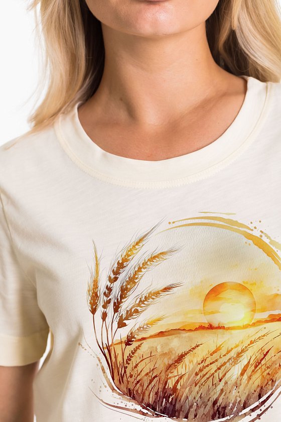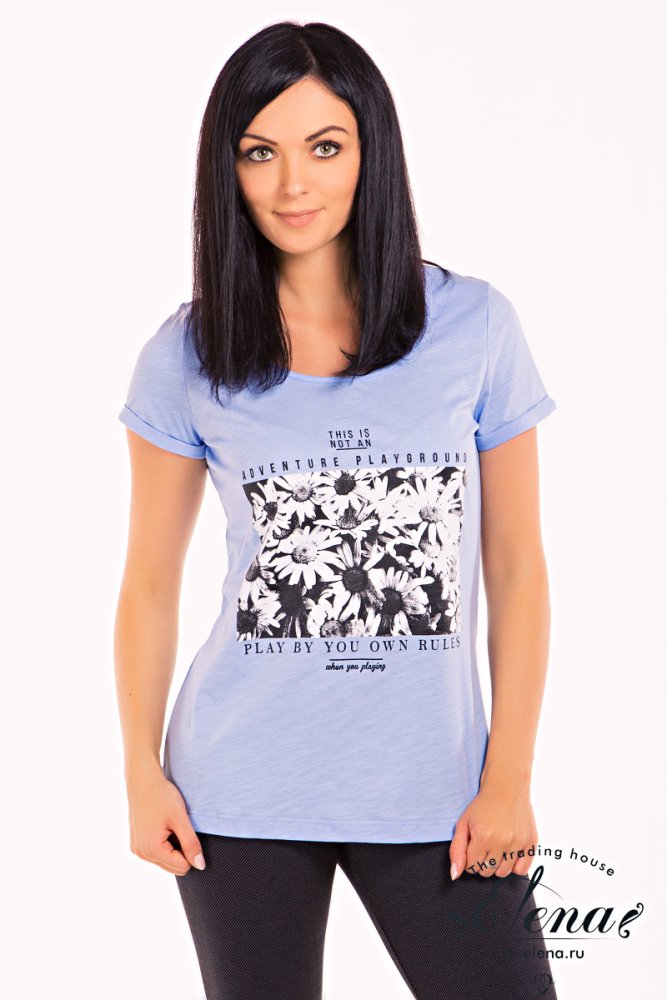 Женская футболка с принтом изготовлена из хлопкового полотна - кулирка "фламли", что обеспечивает комфорт и хорошую воздухопроницаемость. Футболка имеет короткий рукав и круглый вырез горловины, что придает ей классический стильный вид. Такая модель футболки отлично сочетается с джинсами, брюками или юбкой. Изготовленная из натуральной ткани, футболка обеспечит комфорт в течение всего дня.