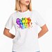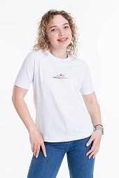 Женская футболка с принтом спереди изготовлена из хлопкового полотна с добавлением лайкры. Футболка с коротким втачным рукавом и круглым вырезом горловины, что придает ей классический стильный вид. Такая модель футболки отлично сочетается с джинсами, брюками или юбкой. Изготовленная из натуральной ткани, футболка обеспечит комфорт в течение всего дня.