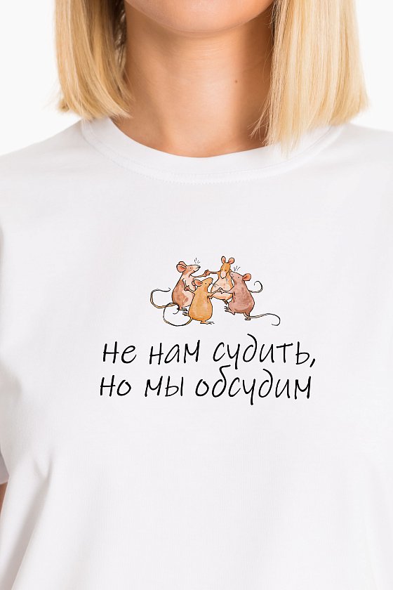 Женская футболка с принтом спереди изготовлена из хлопкового полотна с добавлением лайкры. Футболка с коротким втачным рукавом и круглым вырезом горловины, что придает ей классический стильный вид. Такая модель футболки отлично сочетается с джинсами, брюками или юбкой. Изготовленная из натуральной ткани, футболка обеспечит комфорт в течение всего дня.
