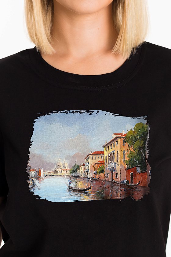 Женская футболка с принтом спереди изготовлена из хлопкового полотна. Футболка с коротким втачным рукавом и круглым вырезом горловины, что придает ей классический стильный вид. Такая модель футболки отлично сочетается с джинсами, брюками или юбкой. Изготовленная из натуральной ткани, футболка обеспечит комфорт в течение всего дня.