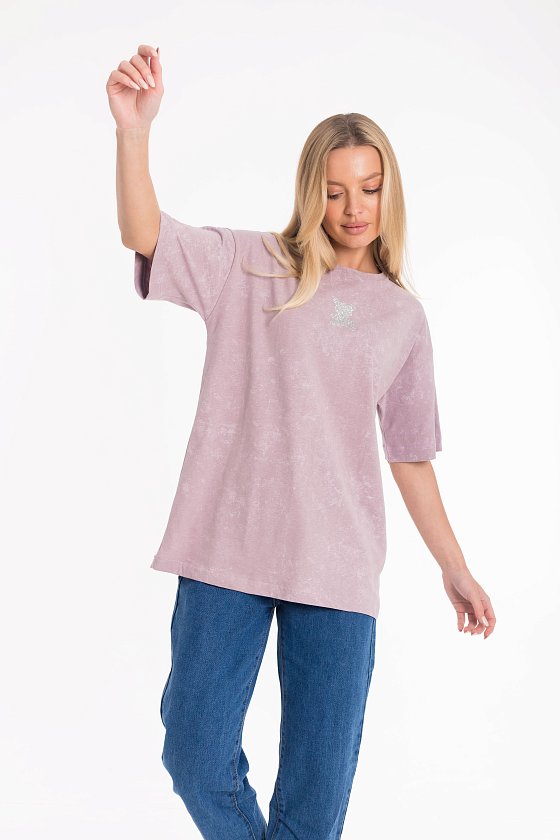 Женская футболка из лёгкой и приятной к телу ткани — отличный выбор для повседневного гардероба. Изготовлена из однотонной кулирки розового цвета, имеет свободный силуэт и круглый вырез горловины. Принт на полочке добавляет изделию оригинальность. Футболка идеально подойдёт для отдыха или домашней носки.