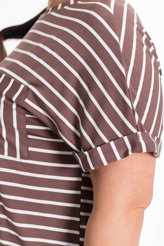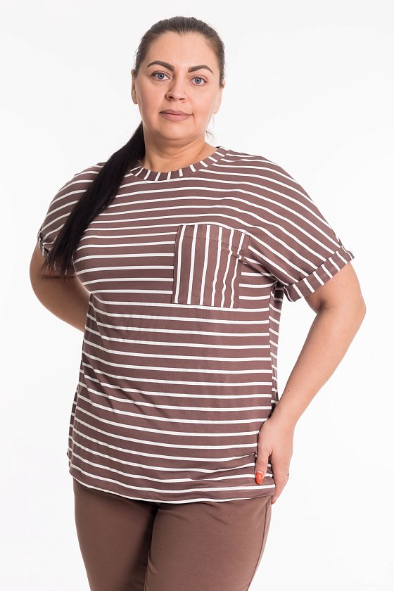 Футболка из вискозного полотна в полоску — базовая модель с современными деталями. Спущенный рукав создаёт мягкий, расслабленный силуэт. Горловина с притачной планкой и отвёрнутые налицо манжеты добавляют чёткости форме. Функциональность и стиль завершает накладной карман на полочке. Универсальная модель для создания повседневных образов.