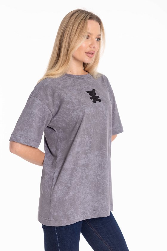Женская футболка из лёгкой и приятной к телу ткани — отличный выбор для повседневного гардероба. Изготовлена из кулирки серого цвета, имеет свободный силуэт и круглый вырез горловины. Принт в виде мишки на полочке добавляет изделию оригинальность. Футболка идеально подойдёт для отдыха или домашней носки.