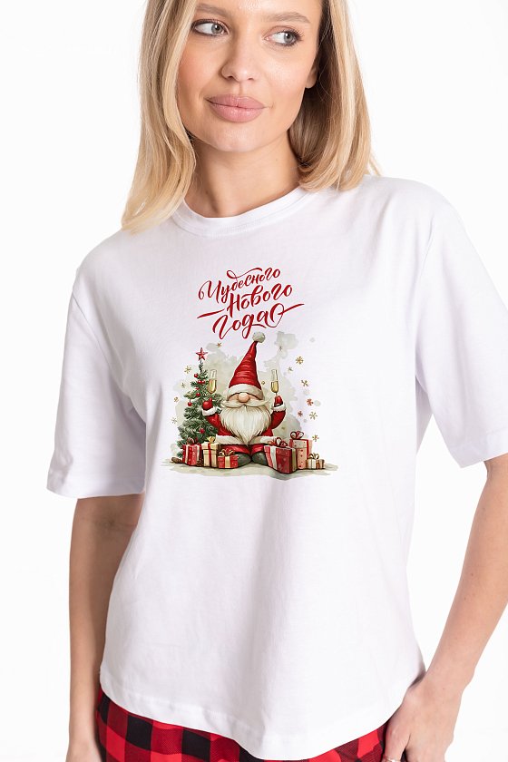 Футболка с новогодним принтом выполнена из хлопкового полотна. Материал приятен к телу, создает комфорт и хорошую воздухопроницаемость. Классический крой с коротким рукавом и круглым вырезом горловины обеспечивает удобную посадку и свободу движений. Отличный выбор для создания праздничного настроения и комфортных повседневных образов.