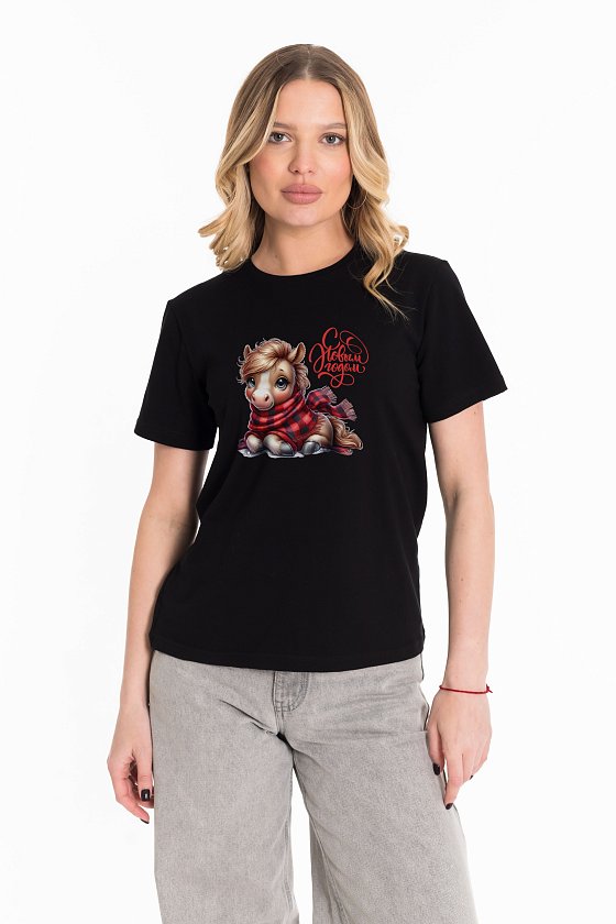 Женская футболка с принтом изготовлена из хлопкового полотна с добавлением лайкры, что обеспечивает комфорт и хорошую воздухопроницаемость. Футболка имеет короткий рукав и круглый вырез горловины, что придает ей классический стильный вид. Такая модель футболки отлично сочетается с джинсами, брюками или юбкой. Изготовленная из натуральной ткани, футболка обеспечит комфорт в течение всего дня.