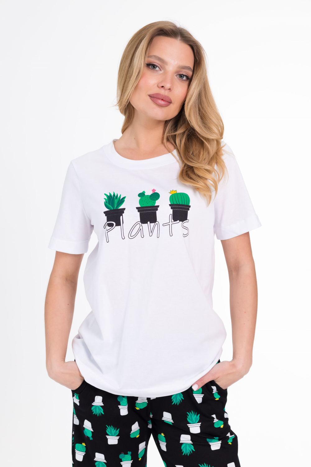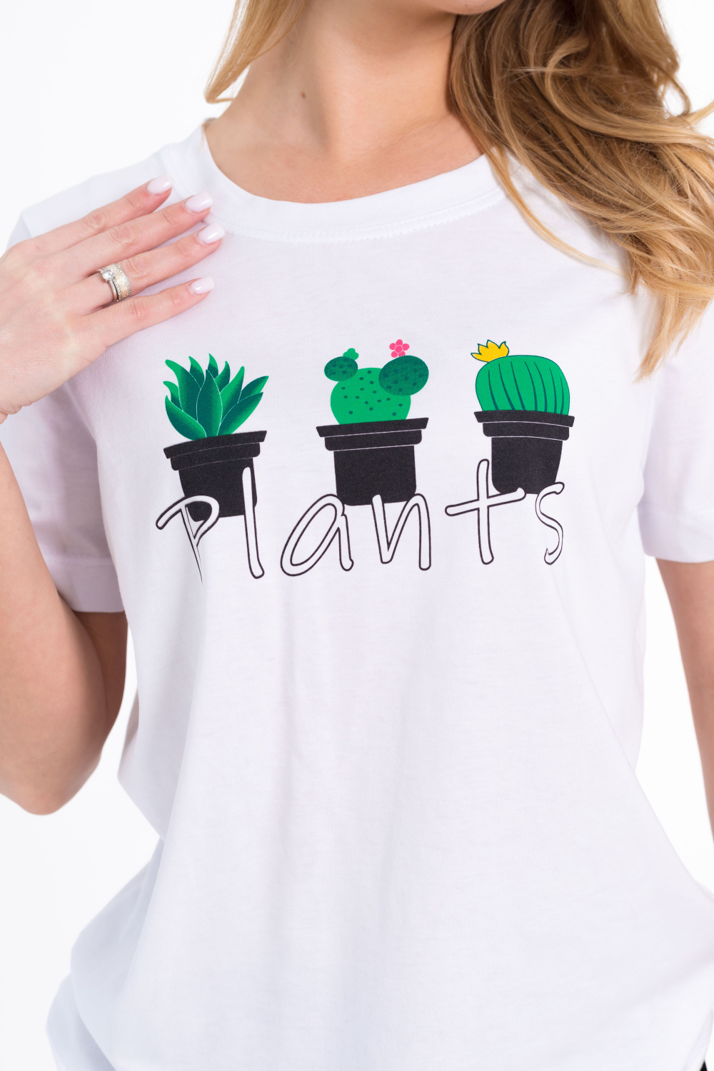 Однотонная футболка с коротким втачным рукавом, круглый вырез горловины, на полочке принт.