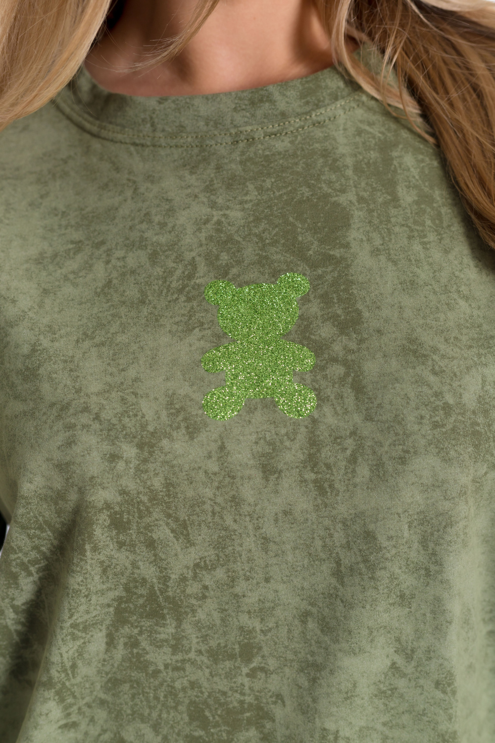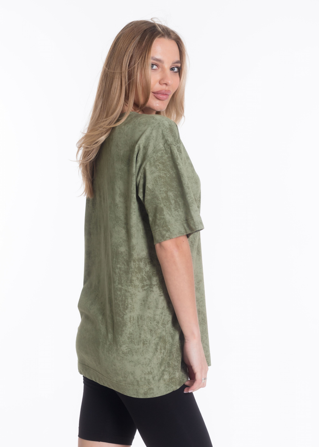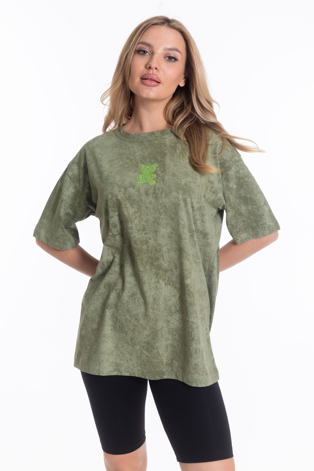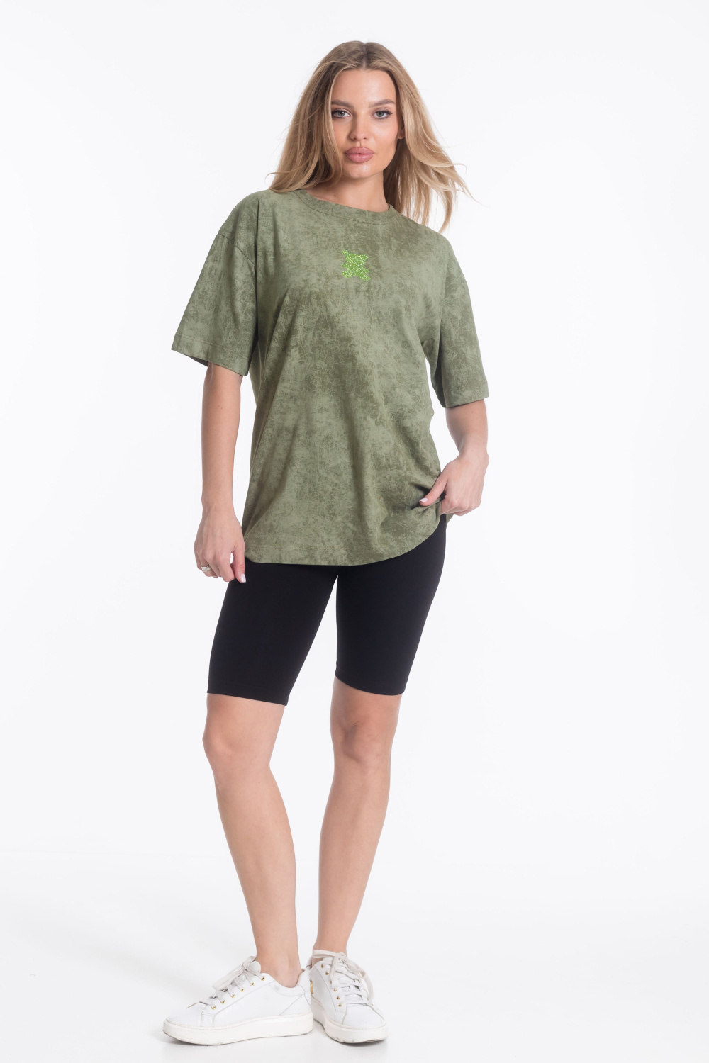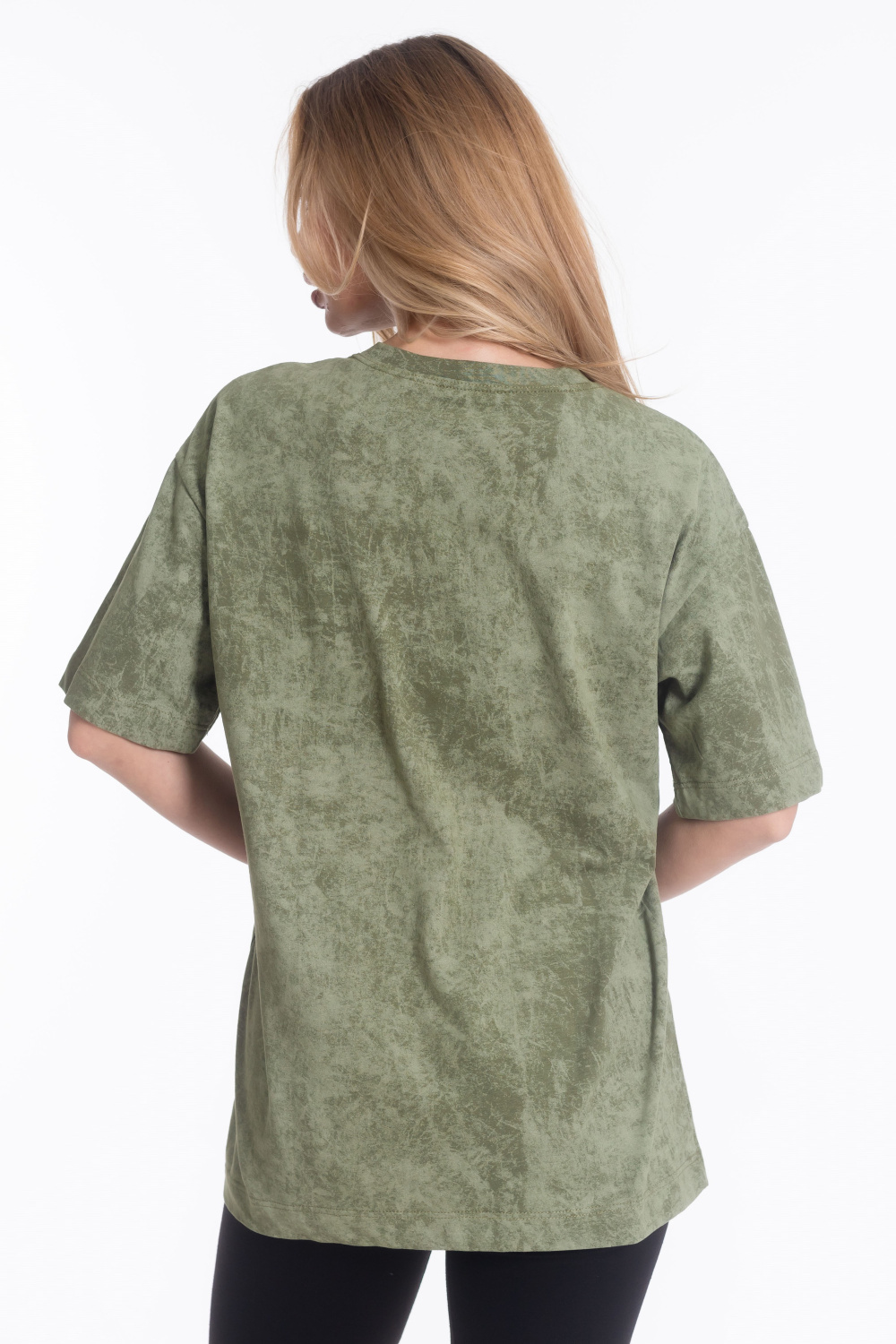 Женская футболка из лёгкой и приятной к телу ткани — отличный выбор для повседневного гардероба. Изготовлена из однотонной кулирки цвета хаки, имеет свободный силуэт и круглый вырез горловины. Принт на полочке добавляет изделию оригинальность. Футболка идеально подойдёт для отдыха или домашней носки.