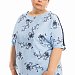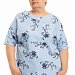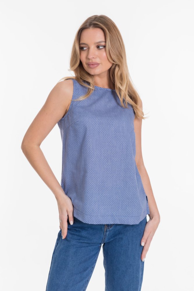 Футболка выполнена из хлопкового полотна. Вырез горловины округлый, линия плеча спущенная, рукав украшен киперной лентой и декоративным разрезом снизу. Низ изделия с закруглениями к боковым швам.