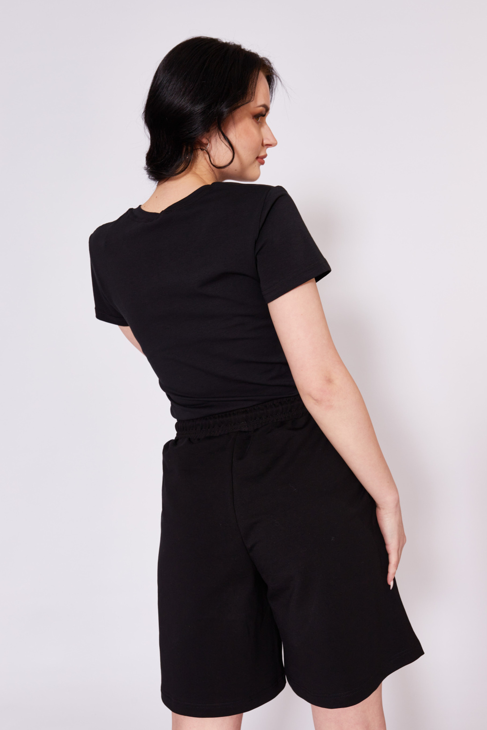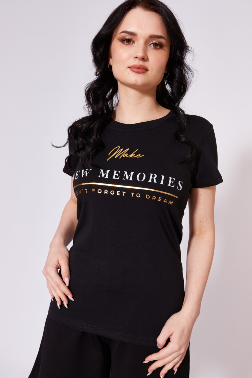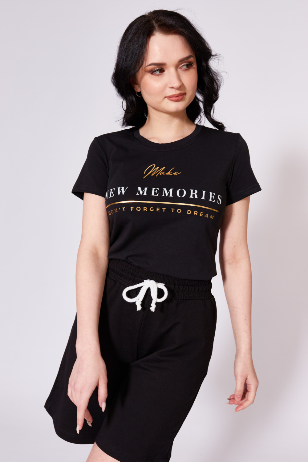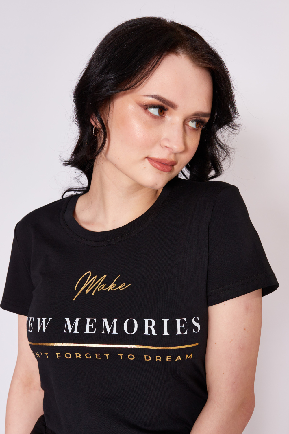Футболка из кулирки с лайкрой с коротким втачным рукавом. Круглый вырез горловины с притачной планкой. Спереди нанесён принт.