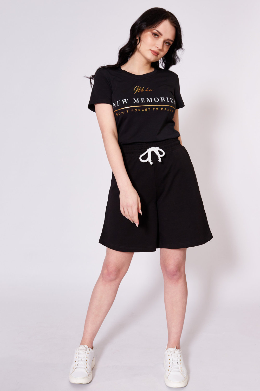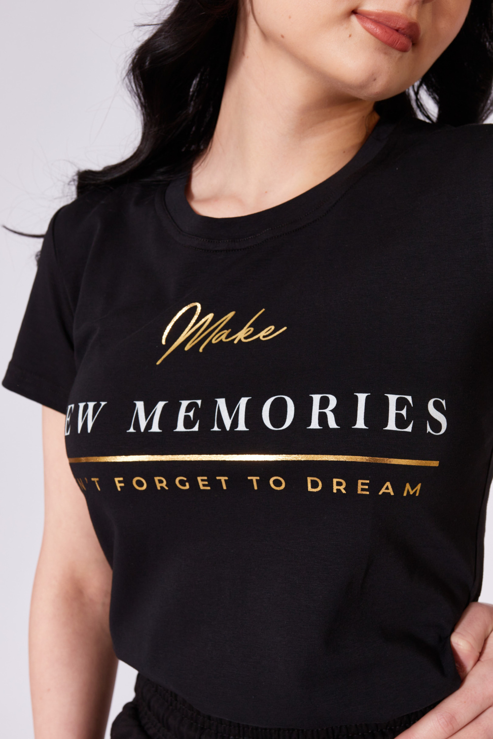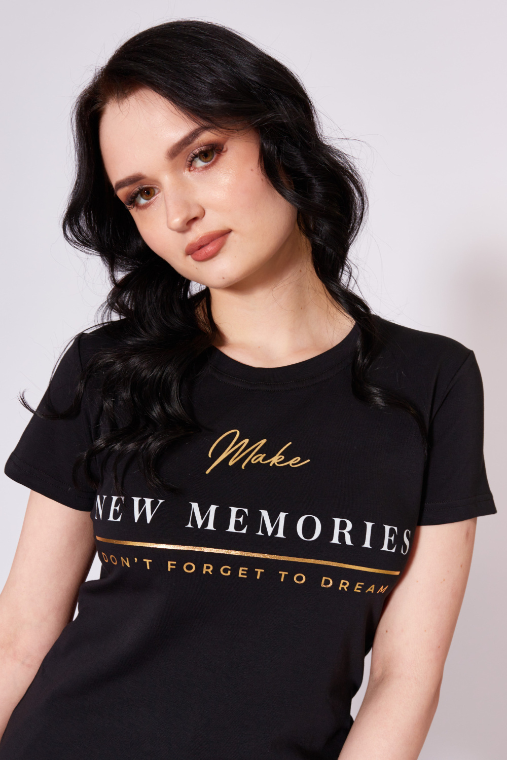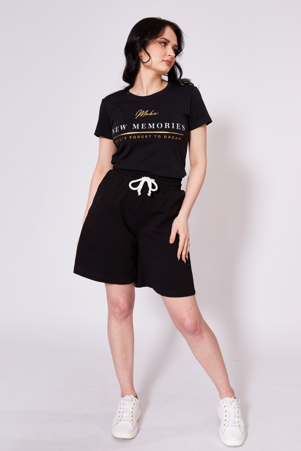 Футболка из кулирки с лайкрой с коротким втачным рукавом. Круглый вырез горловины с притачной планкой. Спереди нанесён принт.