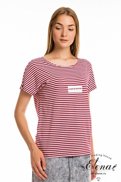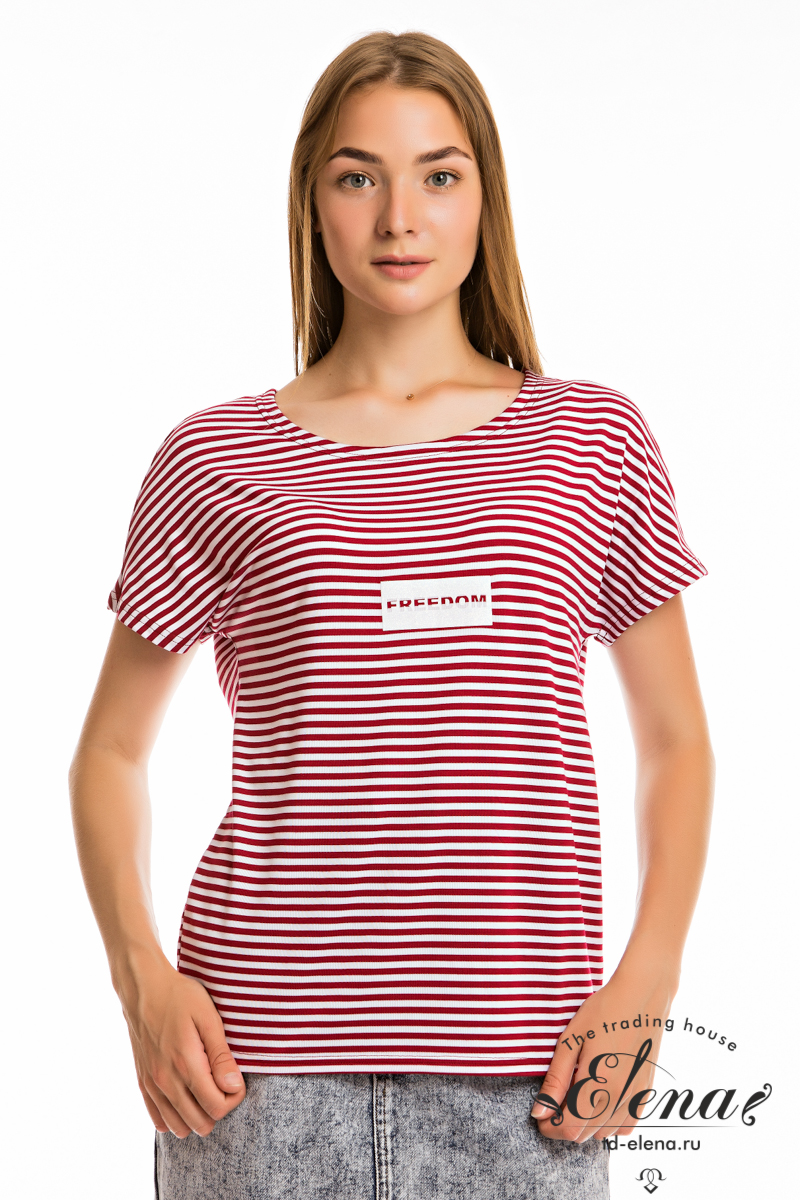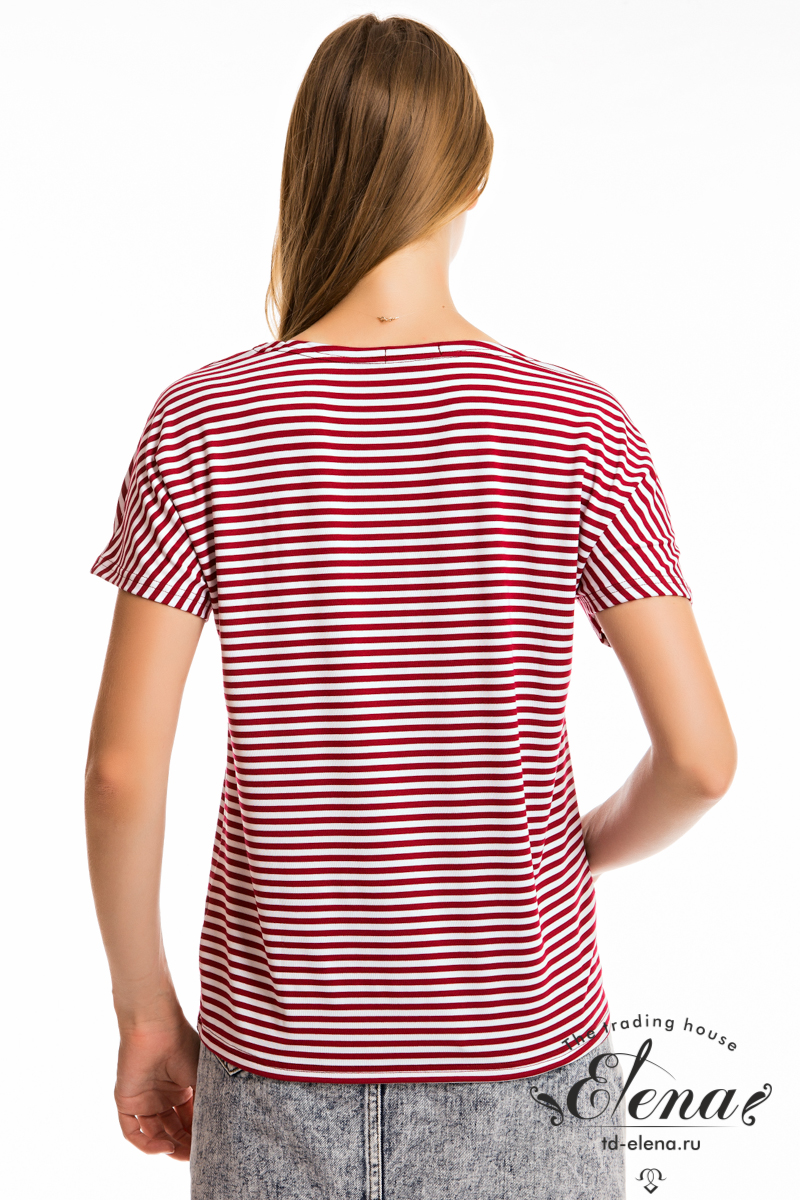 Футболка в полоску выполнена из вискозы. Свободный крой, со спущенным рукавом. Спереди нанесена термопечать.