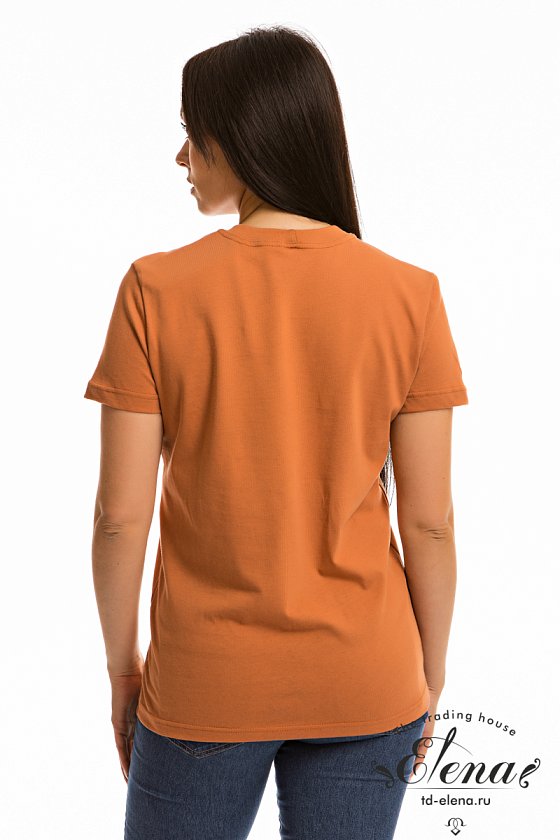 Футболка из однотонной кулирки с коротким втачным рукавом. Спереди нанесён принт.