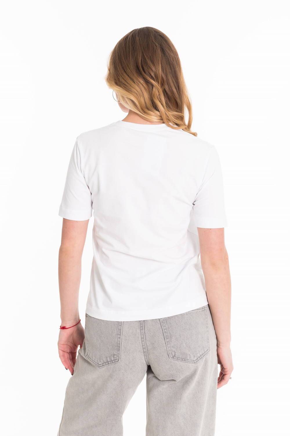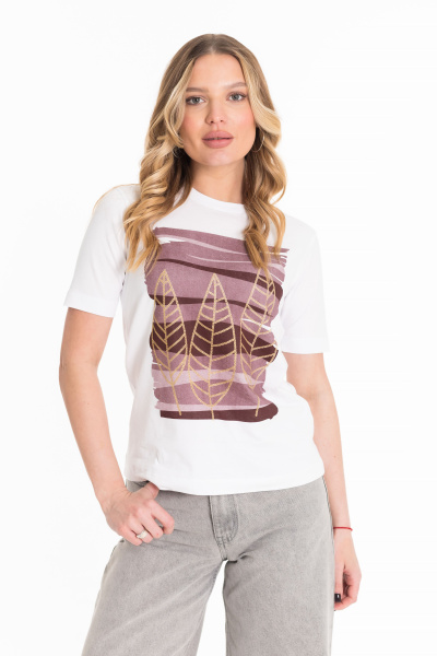 Женская футболка выполнена из однотонной кулирки с лайкрой. С коротким рукавом и круглым вырезом горловины, оформленным планкой. Спереди нанесён принт.