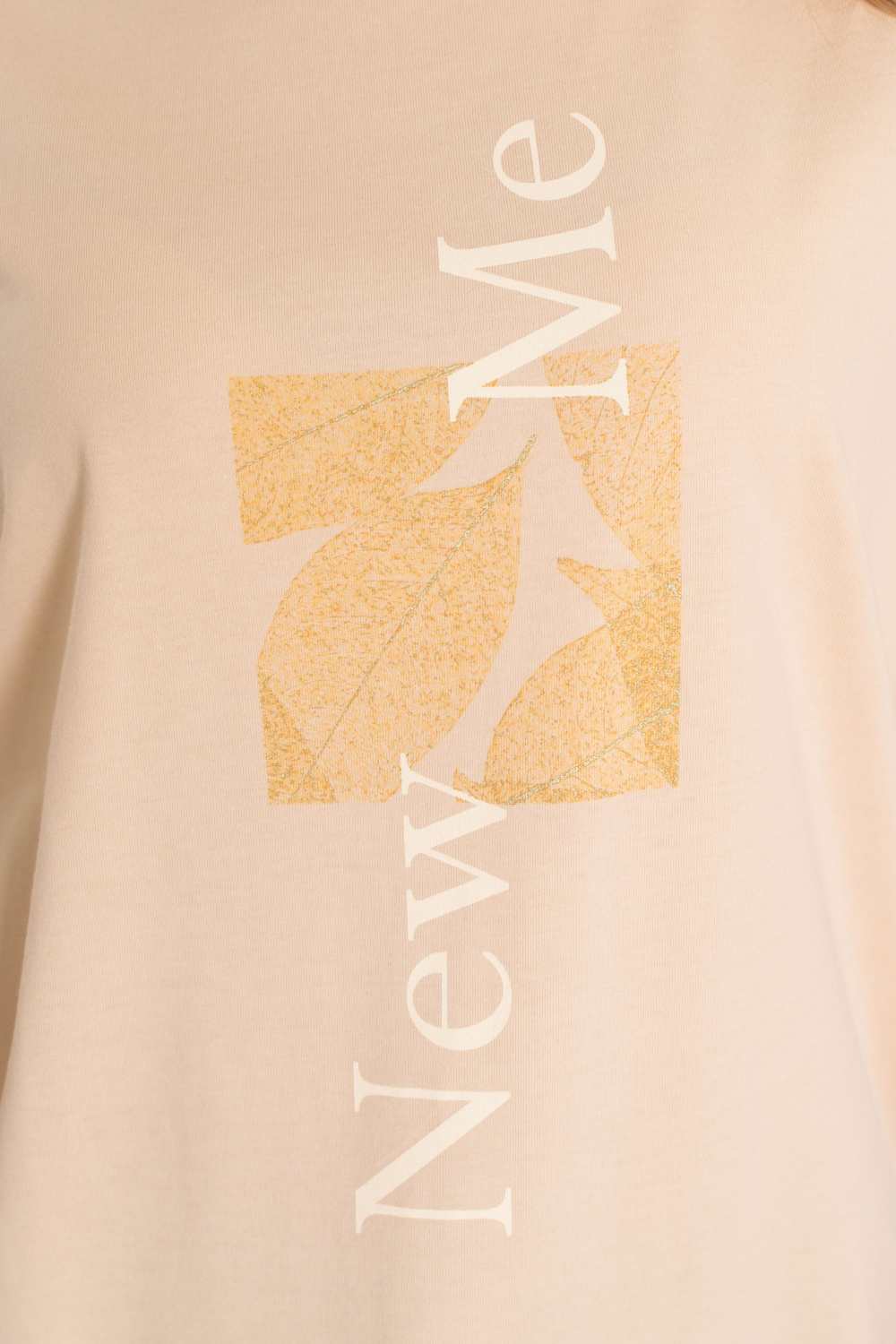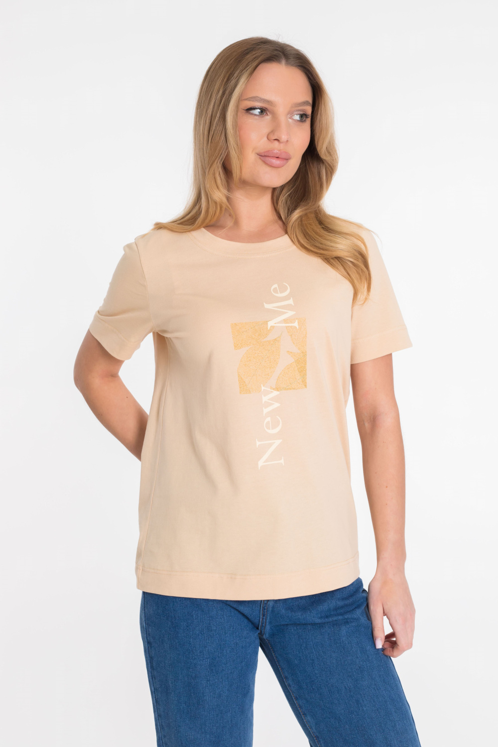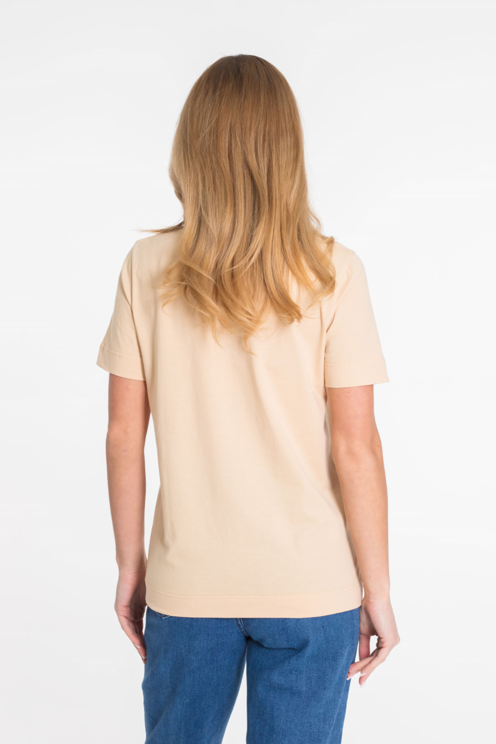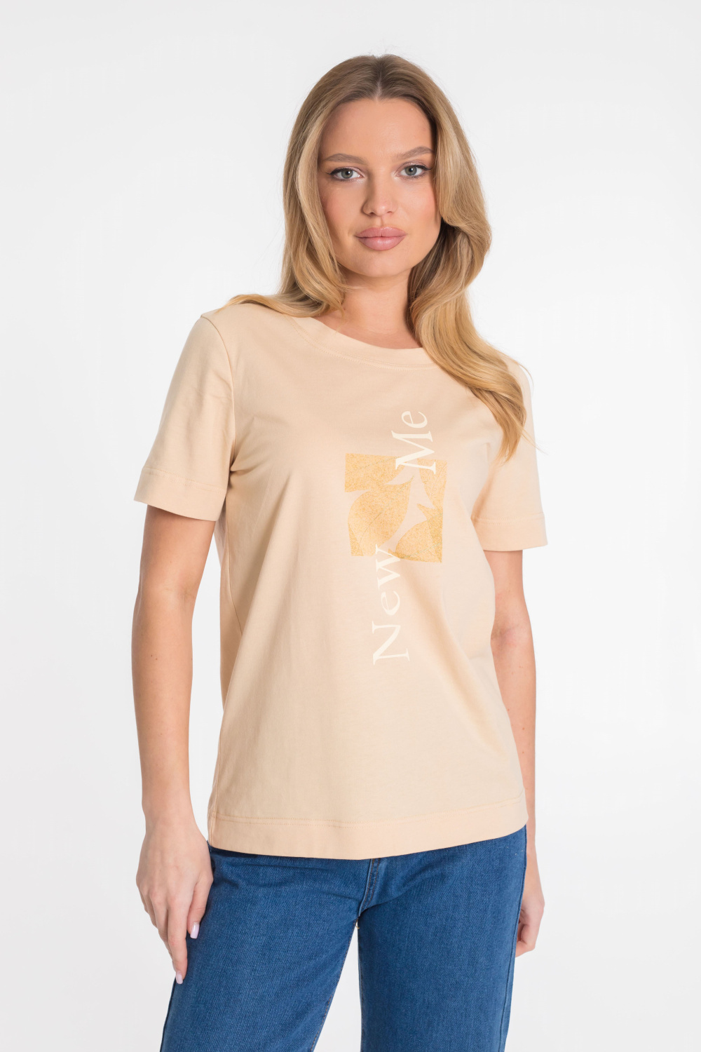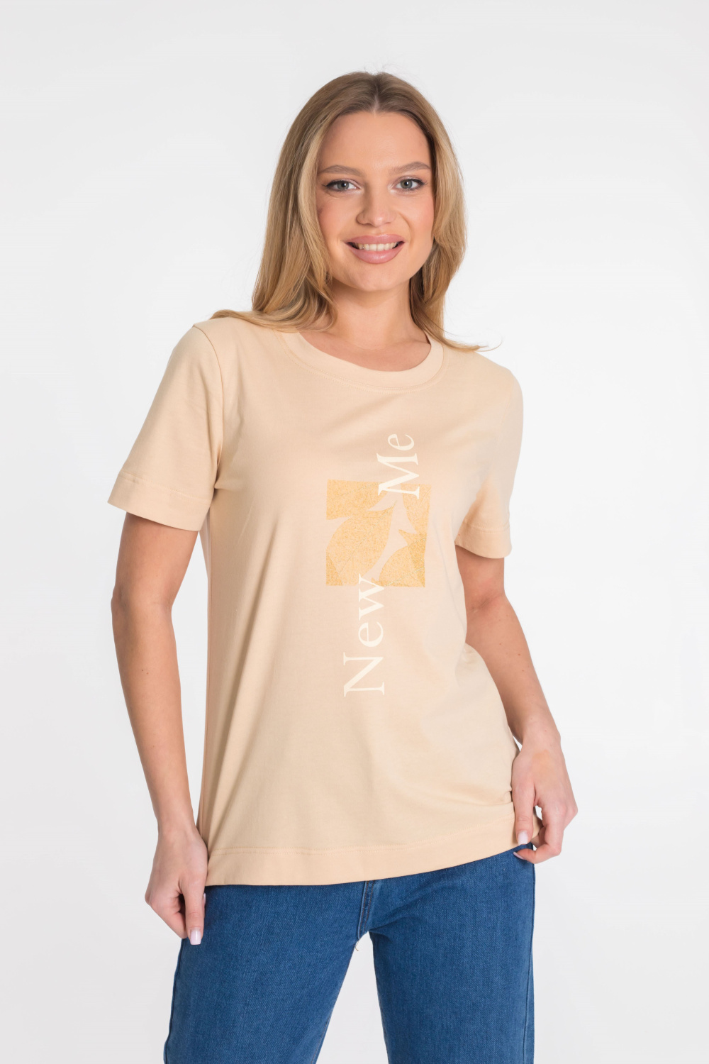 Футболка из однотонной кулирки с коротким втачным рукавом, притачной планкой по горловине.На полочке принт.