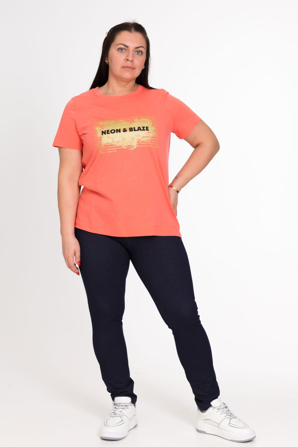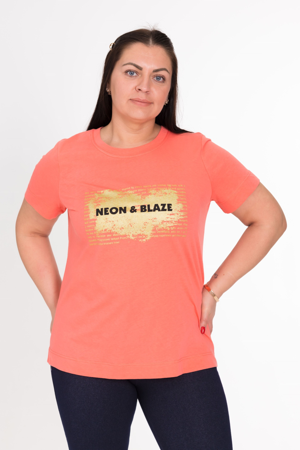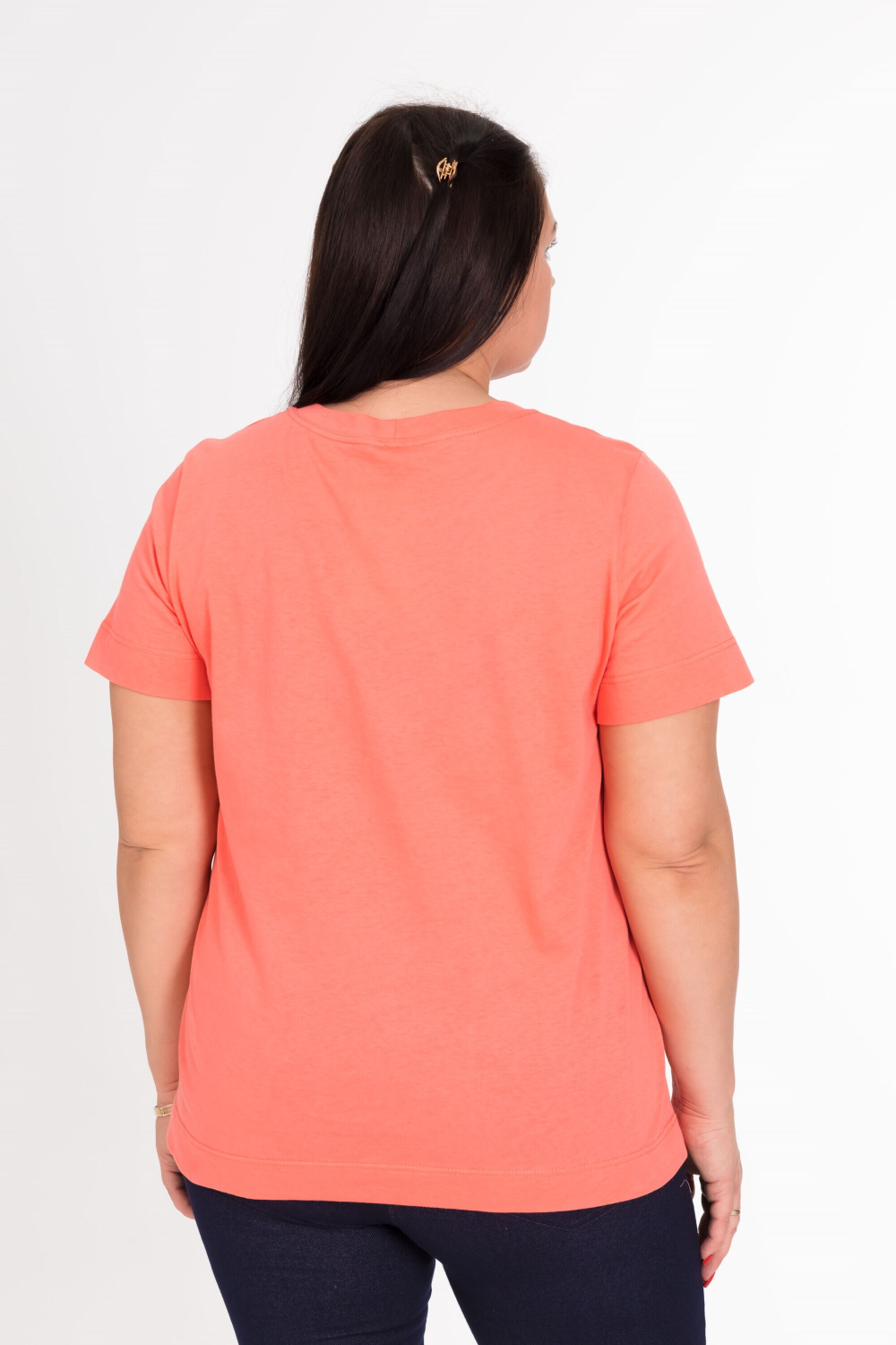Футболка из однотонной кулирки (100% хлопок) с коротким втачным рукавом и притачной планкой по горловине, спереди принт.