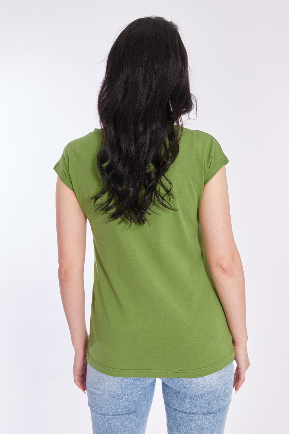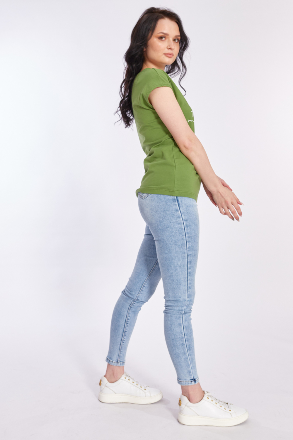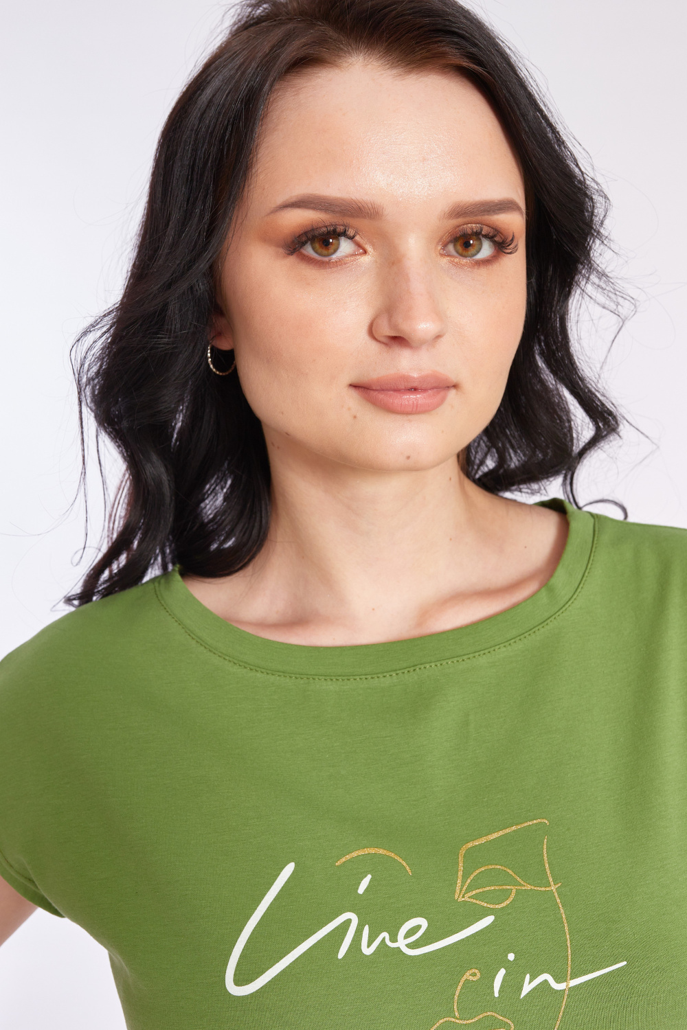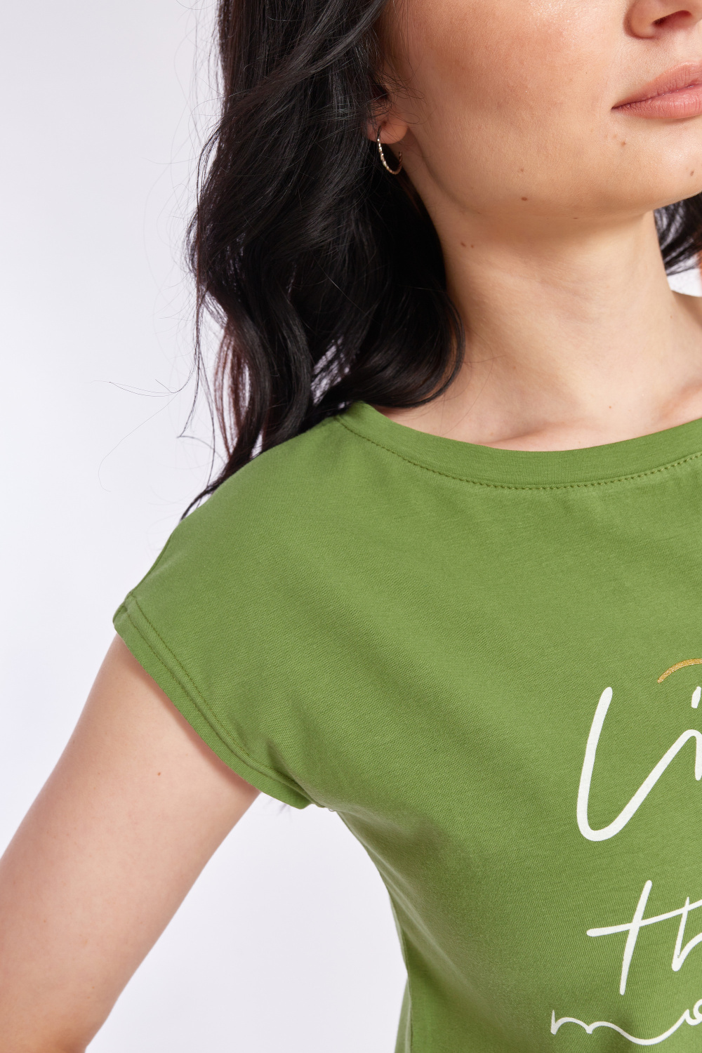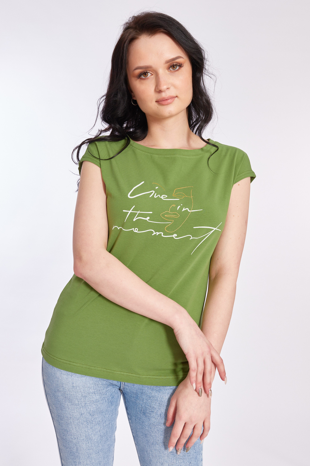 Футболка выполнена из хлопкового полотна c добавлением лайкры. Со спущенной линией плеча и горловиной лодочка. Спереди нанесён принт.