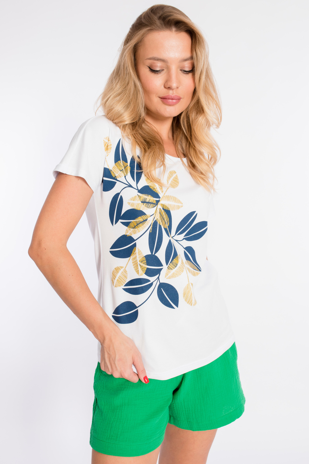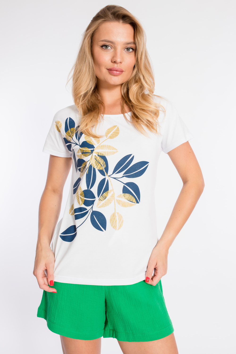 Футболка с цельнокроеным рукавом выполнена из хлопкового полотна с лайкрой. Горловина обработана бейкой. Спереди нанесён оригинальный принт.