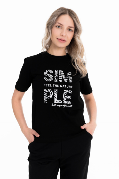Женская футболка выполнена из однотонной кулирки с лайкрой. С коротким рукавом и круглым вырезом горловины, оформленным планкой. Спереди нанесён оригинальный принт.