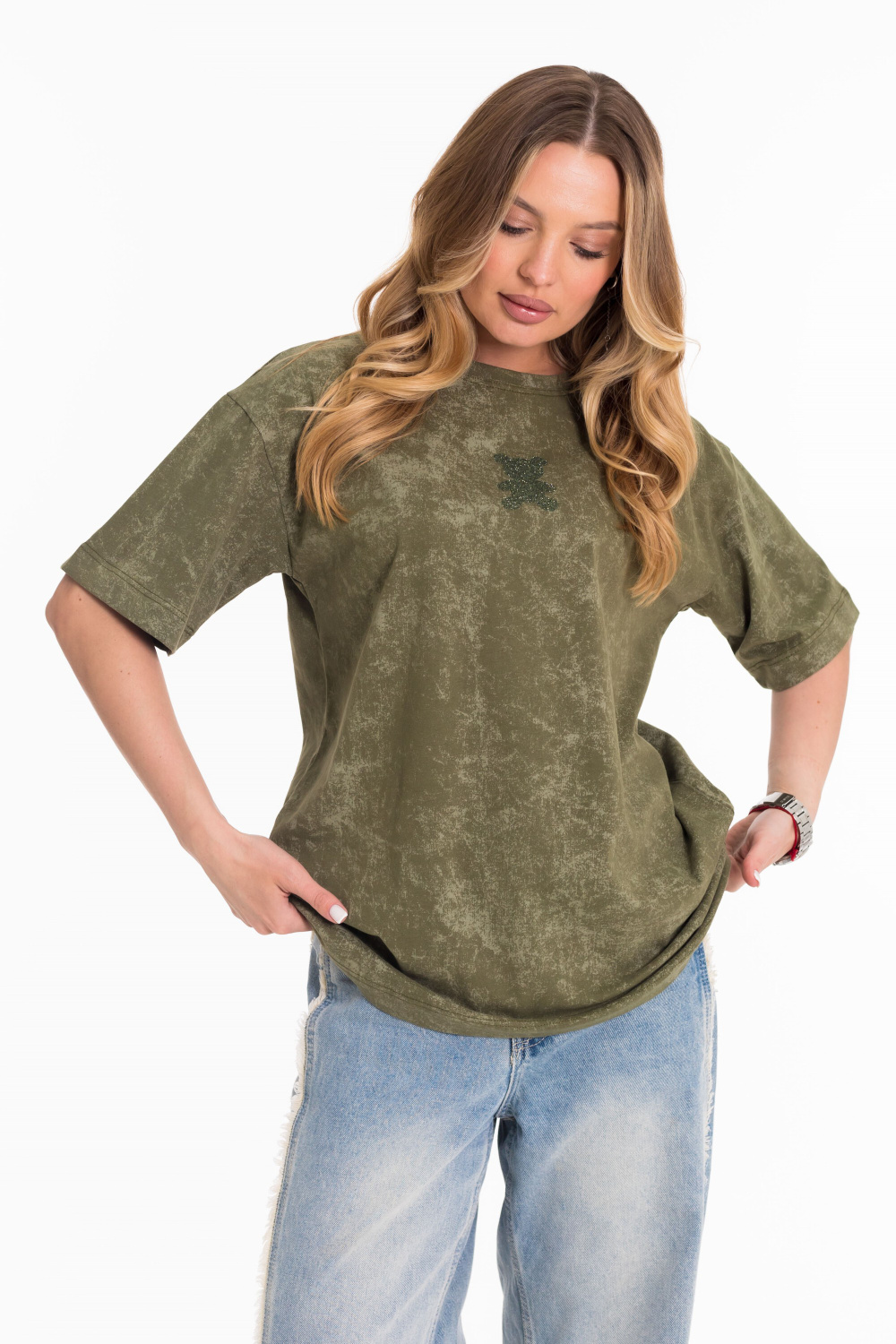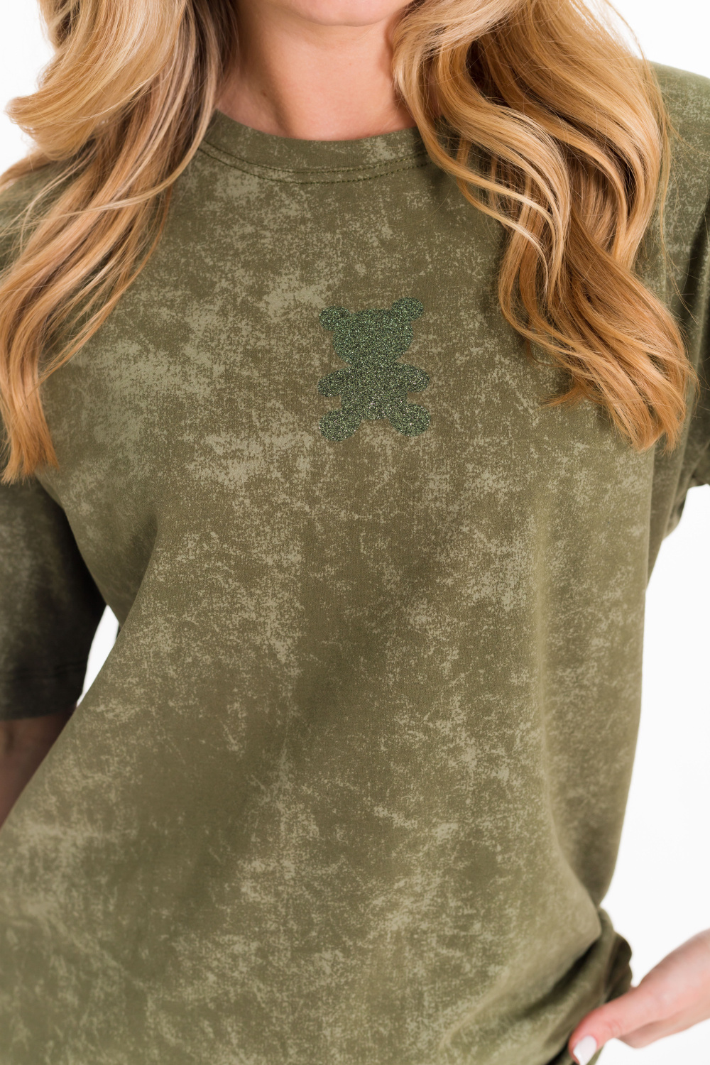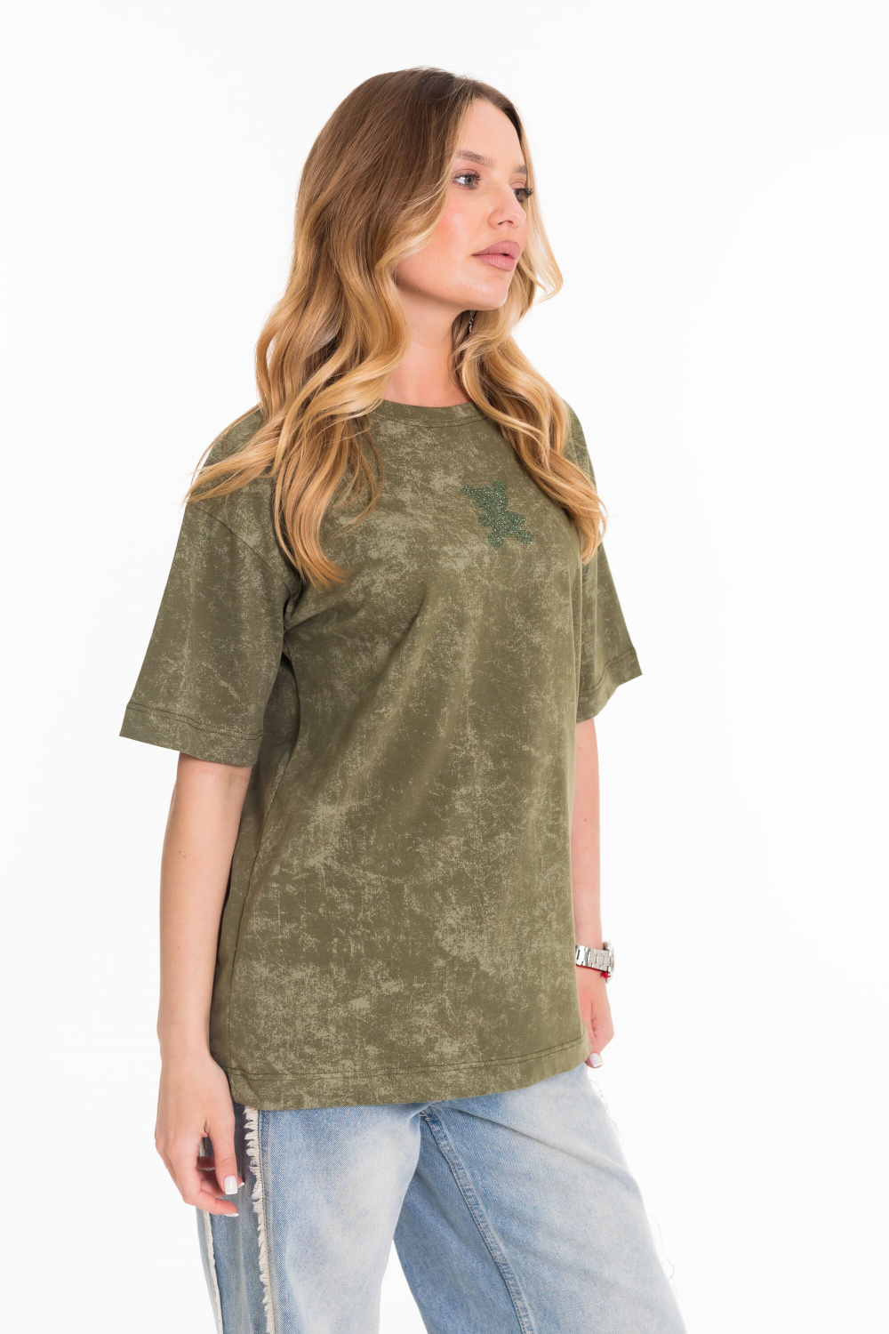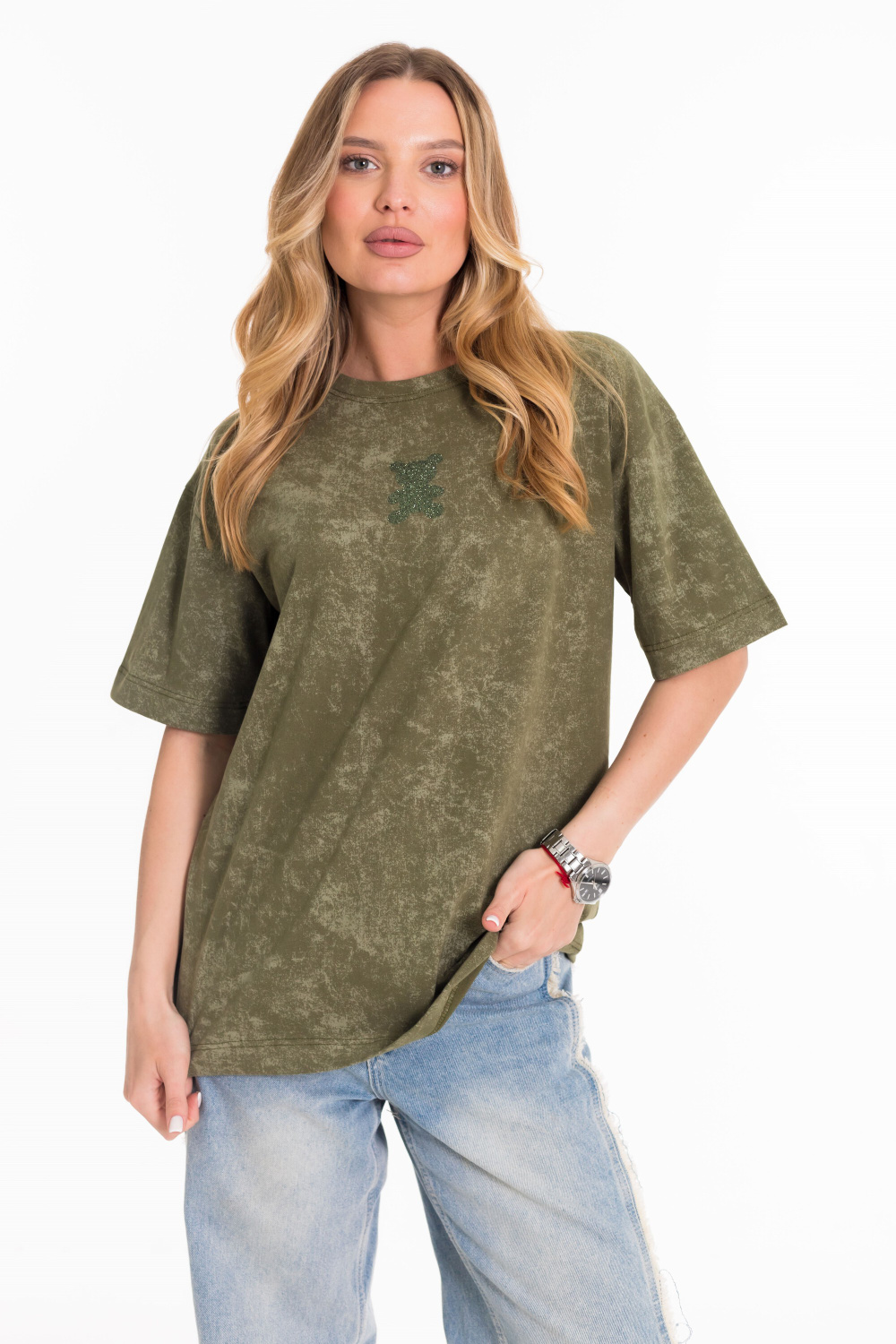 Женская футболка из лёгкой и приятной к телу ткани — отличный выбор для повседневного гардероба. Изготовлена из кулирки цвета "хаки", имеет свободный силуэт и круглый вырез горловины. Принт в виде мишки на полочке добавляет изделию оригинальность. Футболка идеально подойдёт для отдыха или домашней носки.