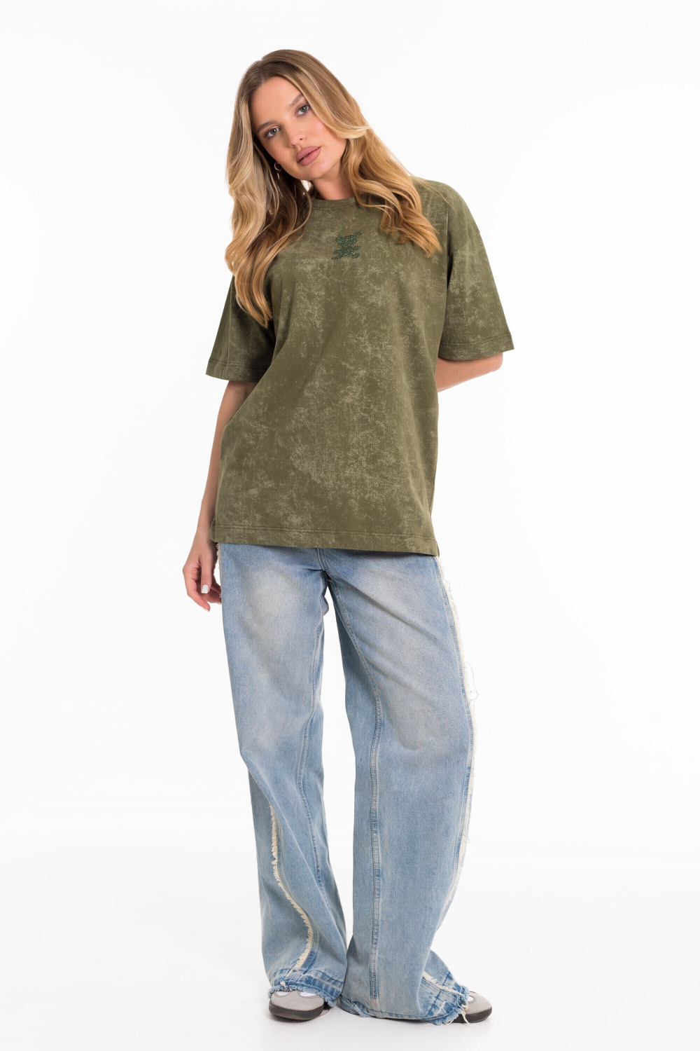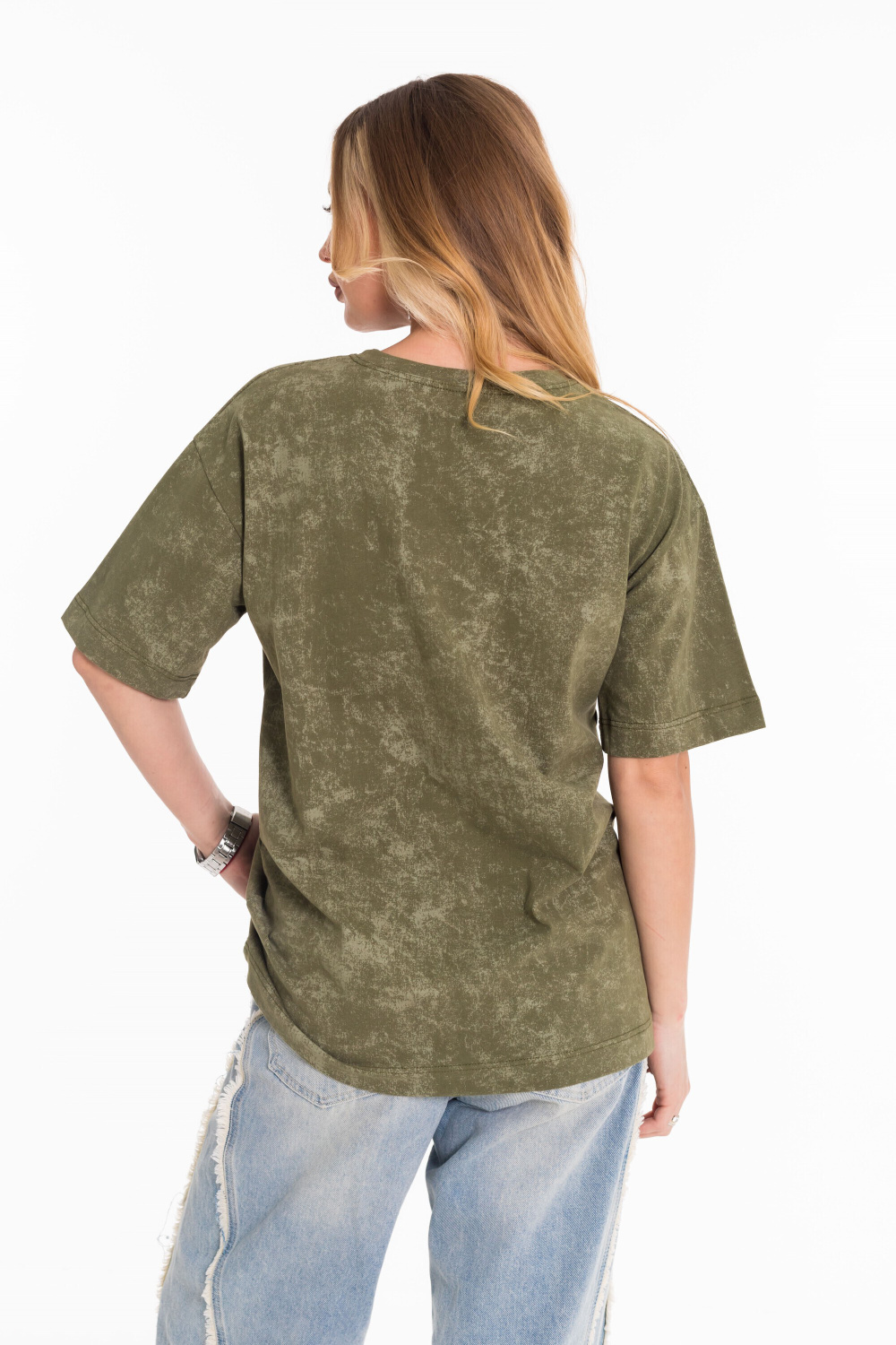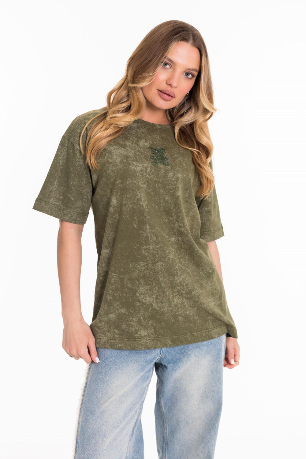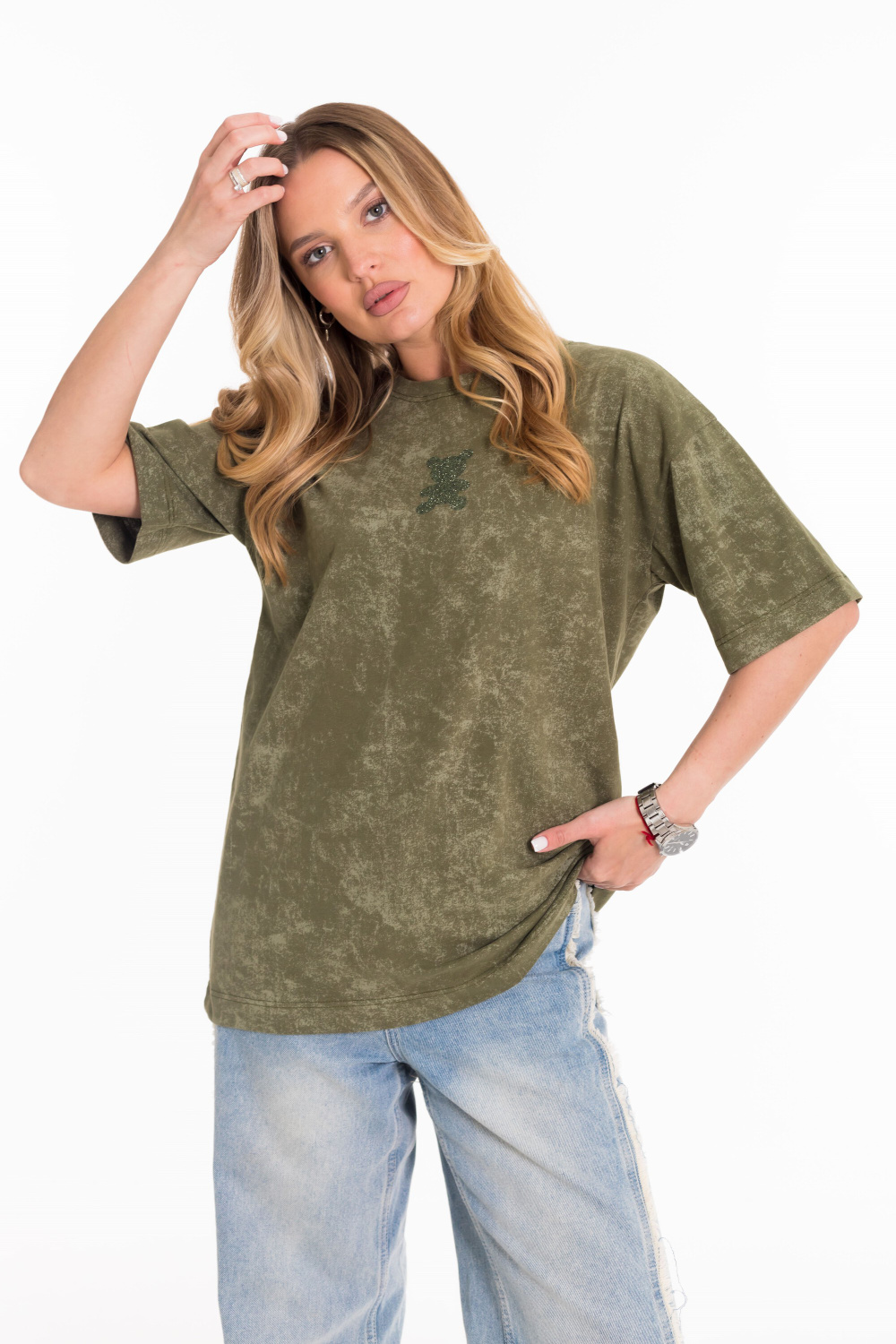 Женская футболка из лёгкой и приятной к телу ткани — отличный выбор для повседневного гардероба. Изготовлена из кулирки цвета "хаки", имеет свободный силуэт и круглый вырез горловины. Принт в виде мишки на полочке добавляет изделию оригинальность. Футболка идеально подойдёт для отдыха или домашней носки.