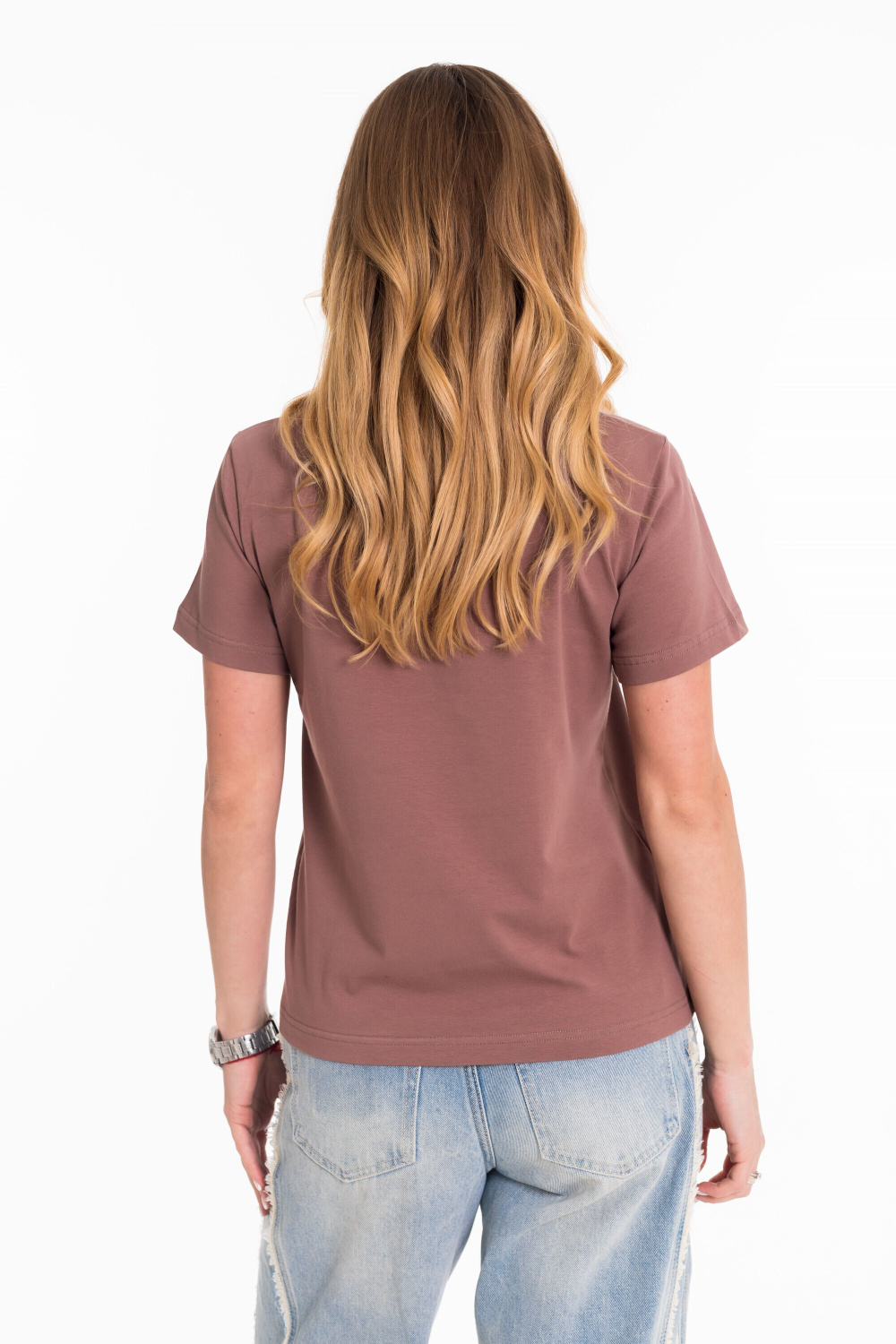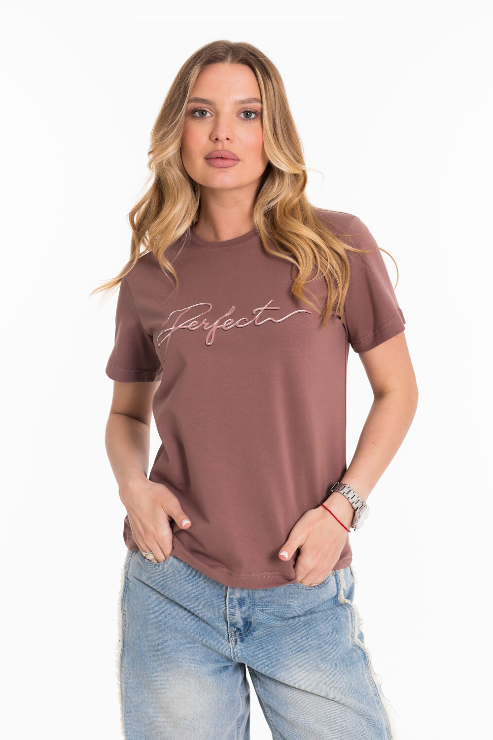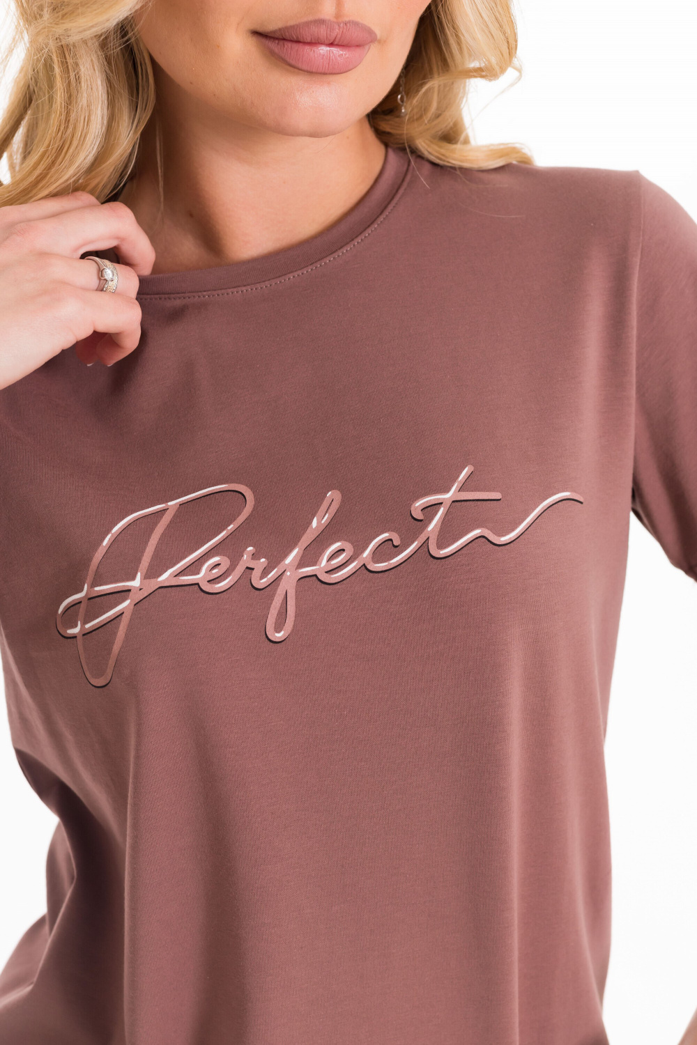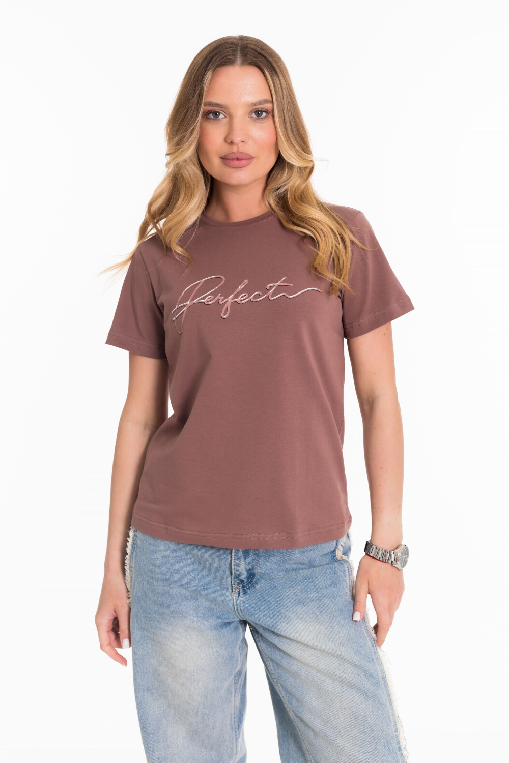 Футболка выполнена из однотонной кулирки с лайкрой. С коротким втачным рукавом и притачной планкой по круглому вырезу горловины. Спереди нанесён принт.
