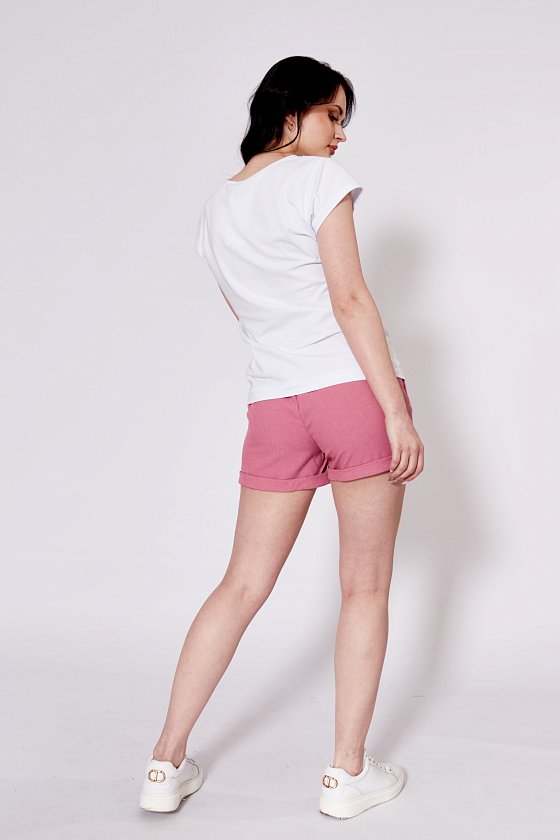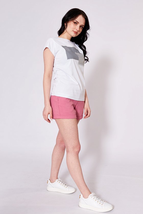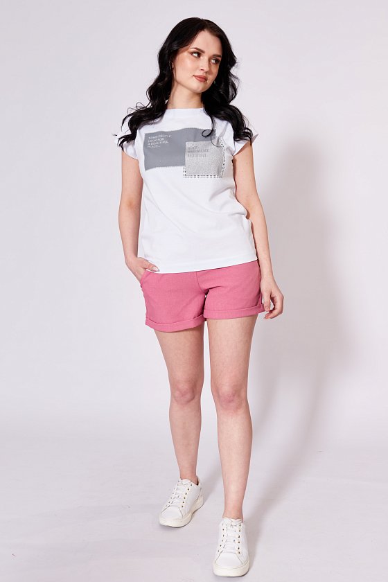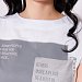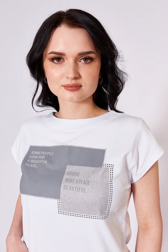 Футболка из однотонной кулирки с лайкрой. Рукав короткий, горловина обработана планкой. Спереди нанесён принт.