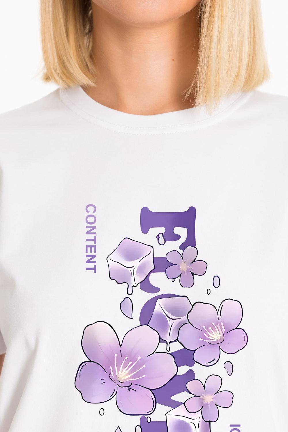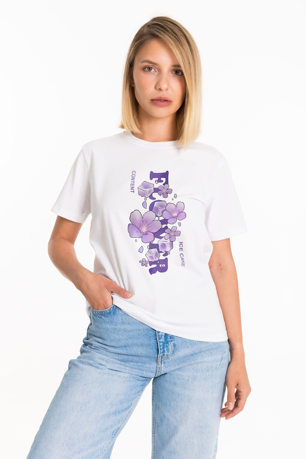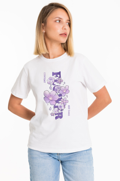 Футболка из однотонной кулирки с лайкрой. С коротким рукавом и притачной планкой по горловине. Спереди нанесён принт.