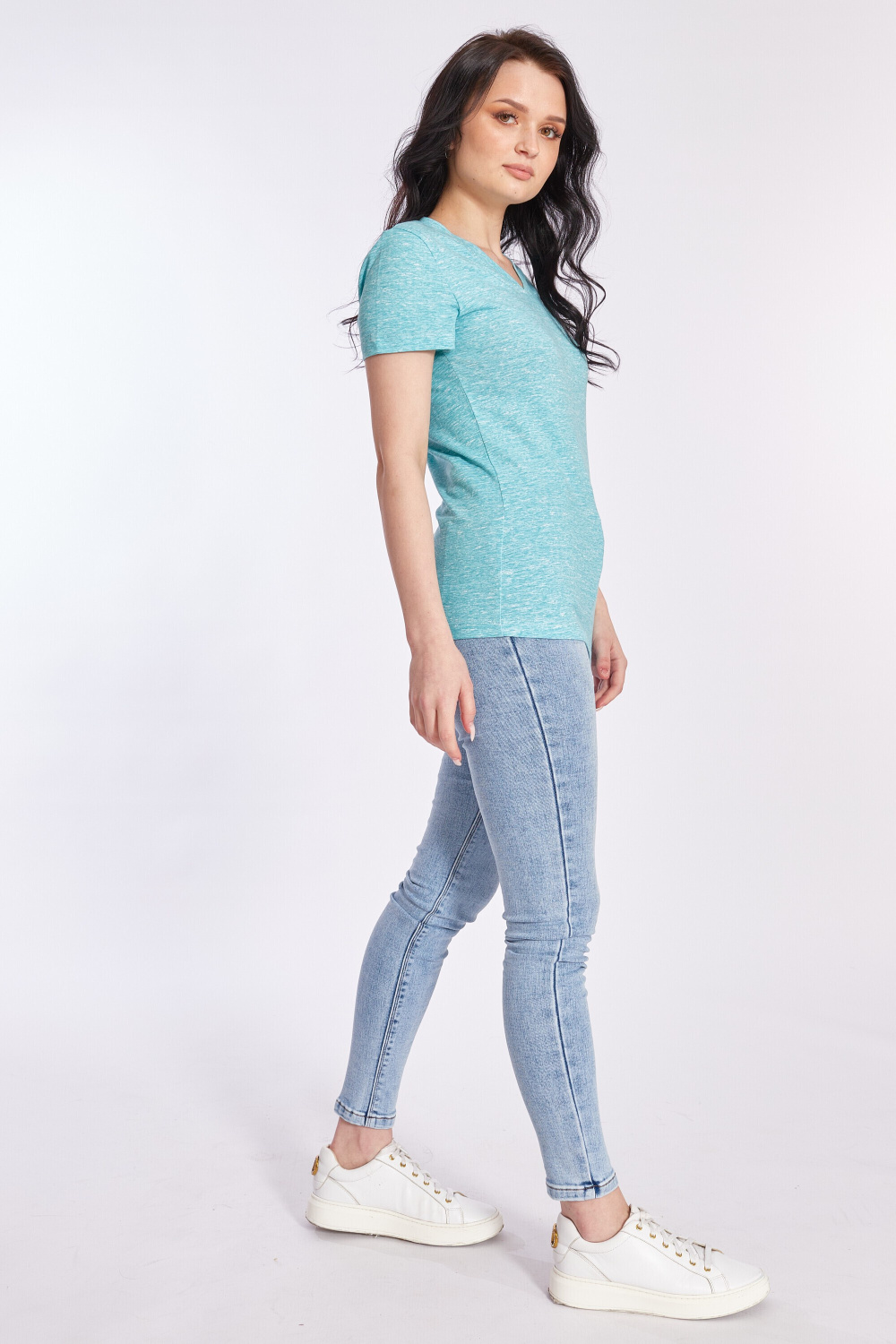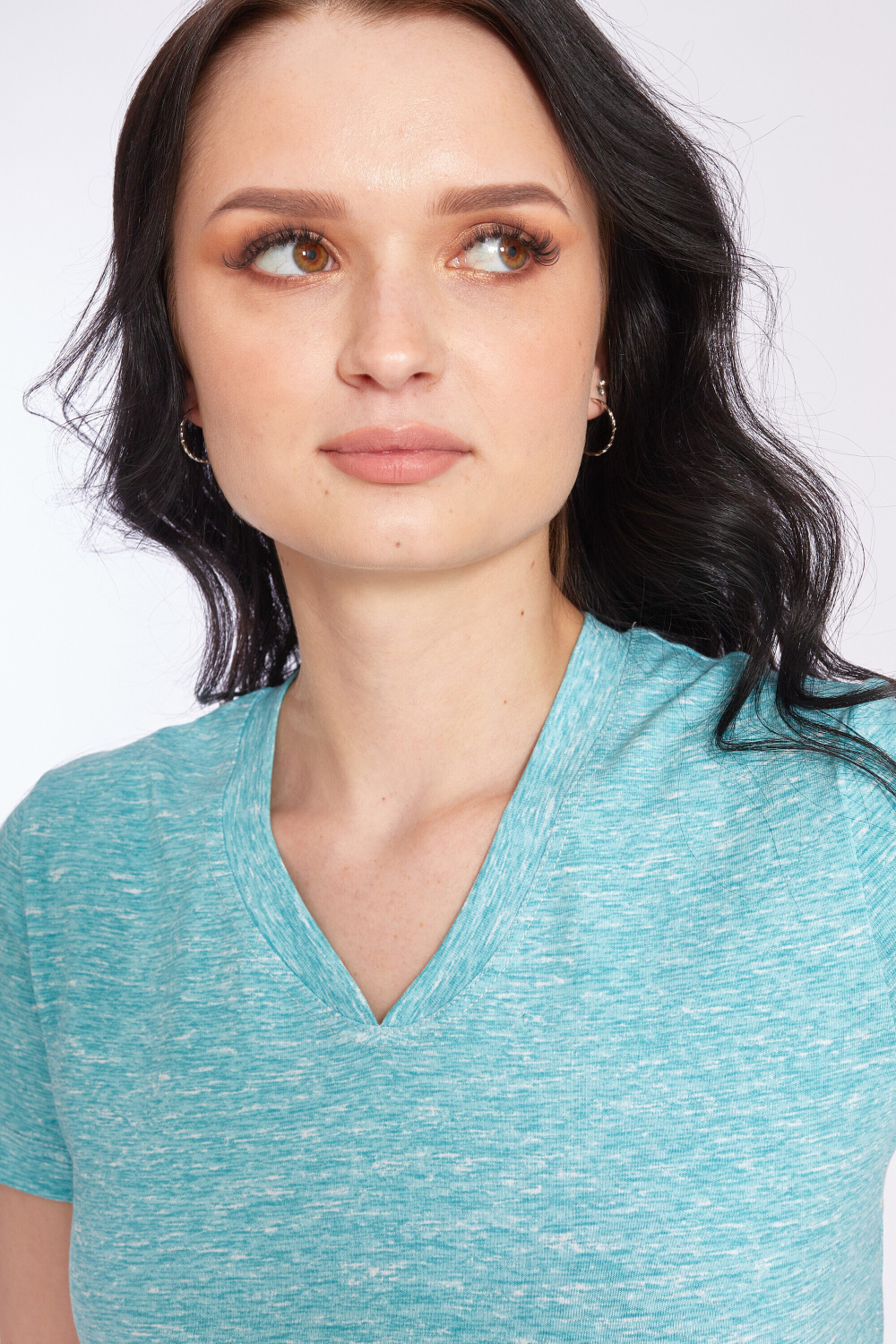 Футболка выполнена из кулирки с лайкрой, силуэт приталенный, рукав короткий, горловина имеет V-образный вырез. На левом рукаве нанесён принт.