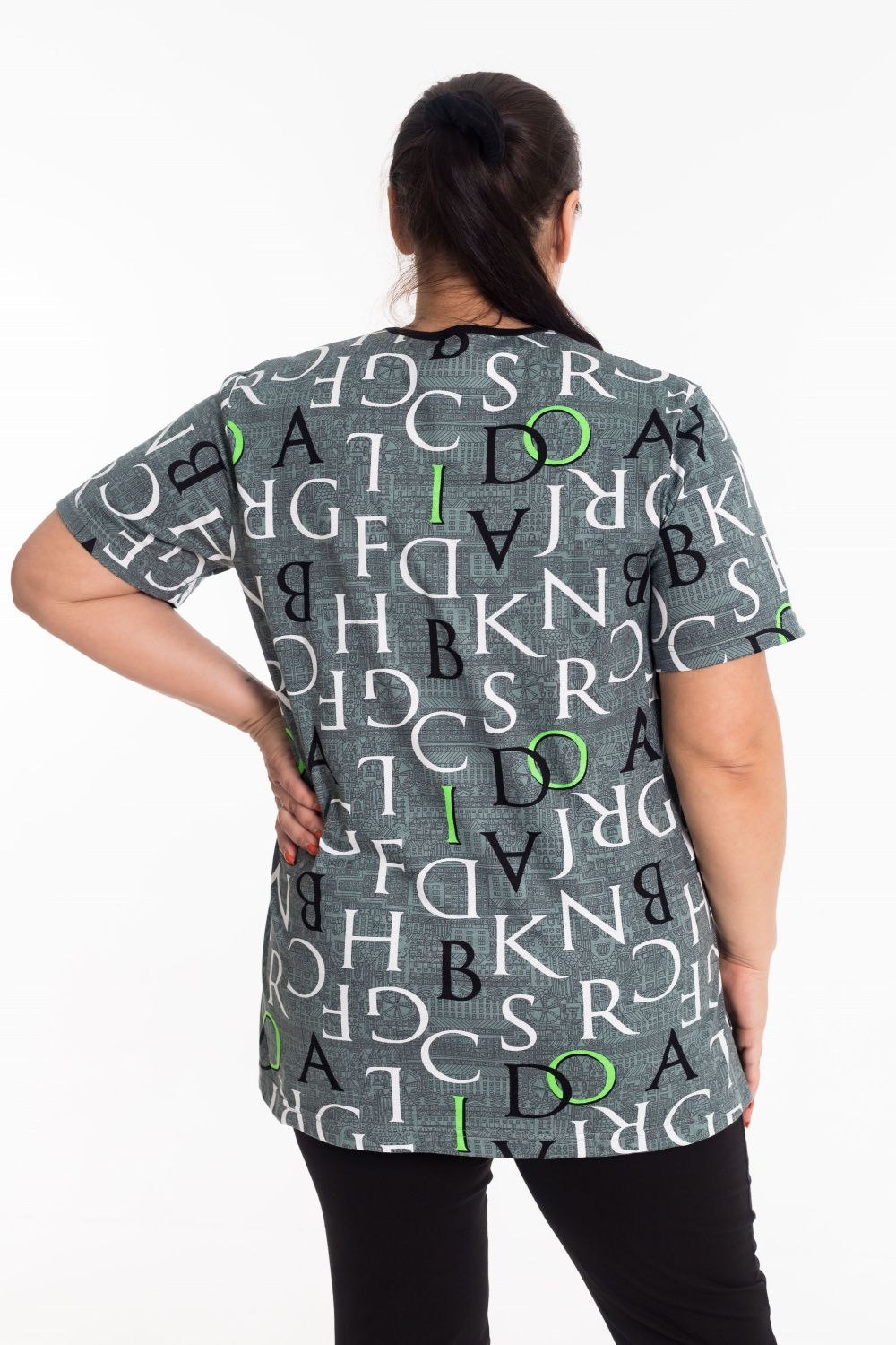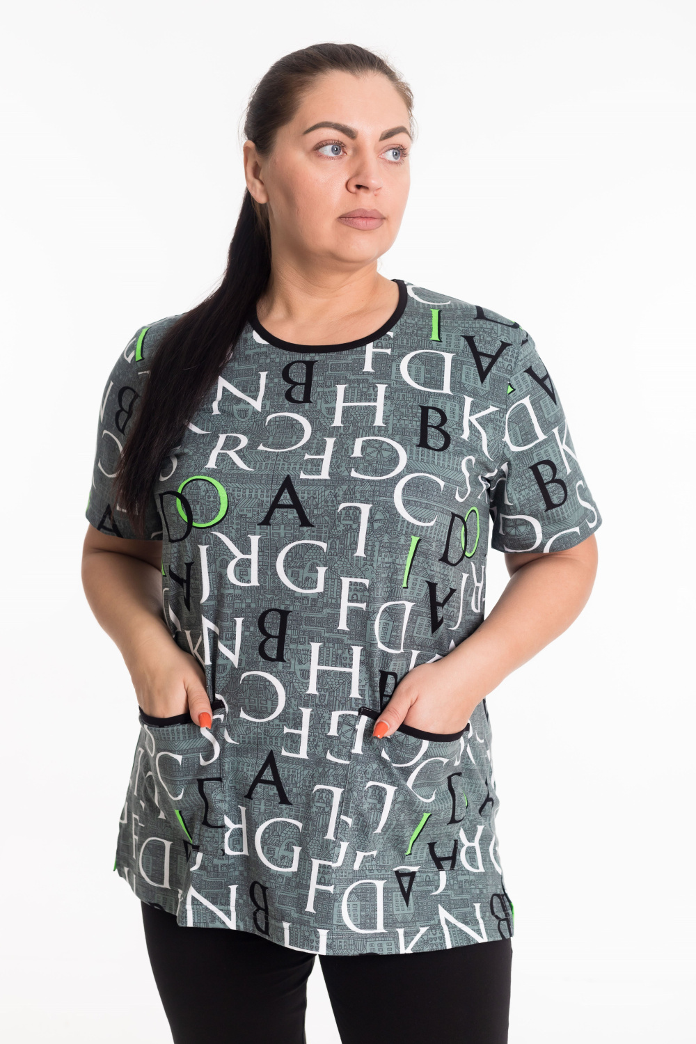 Футболка женская, выполнена из 100% хлопка. Вырез горловины круглый, по бокам расположены карманы.