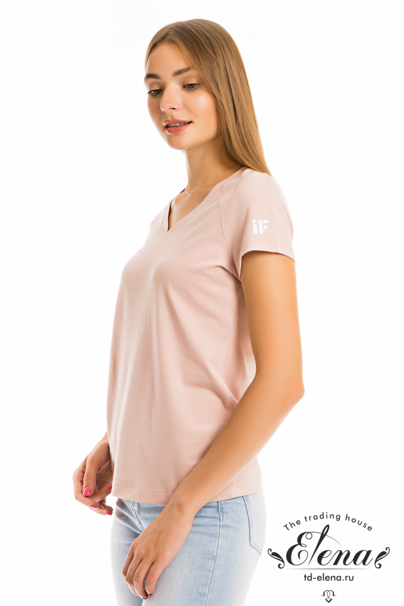 Футболка выполнена из х/б полотна с лайкрой. Вырез горловины V-образный, рукава короткие покроя реглан. На левом рукаве расположен термопринт.