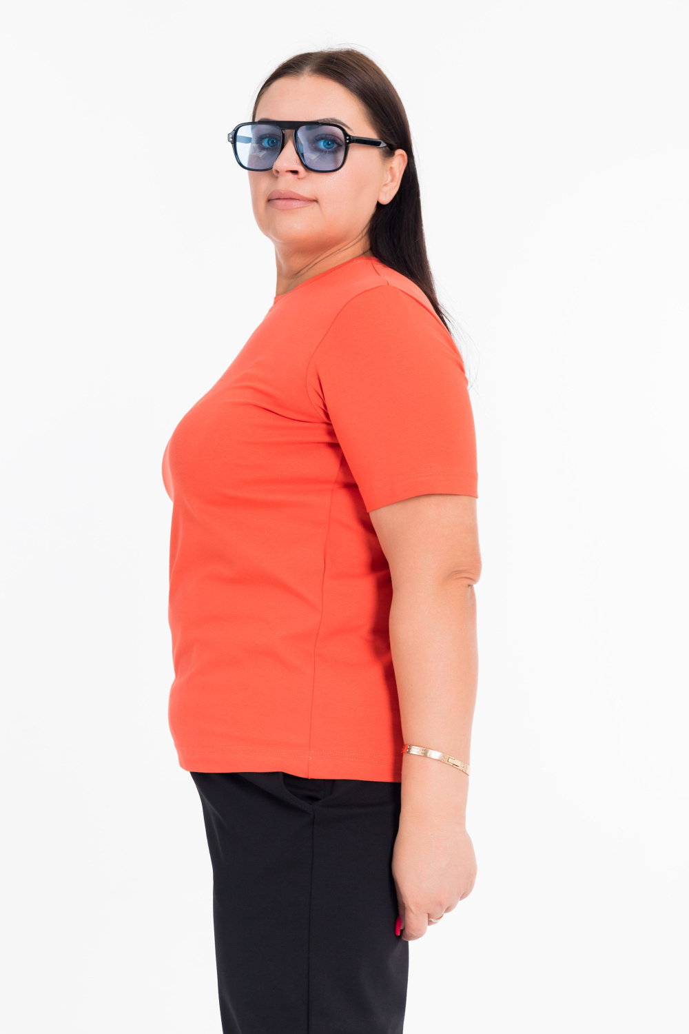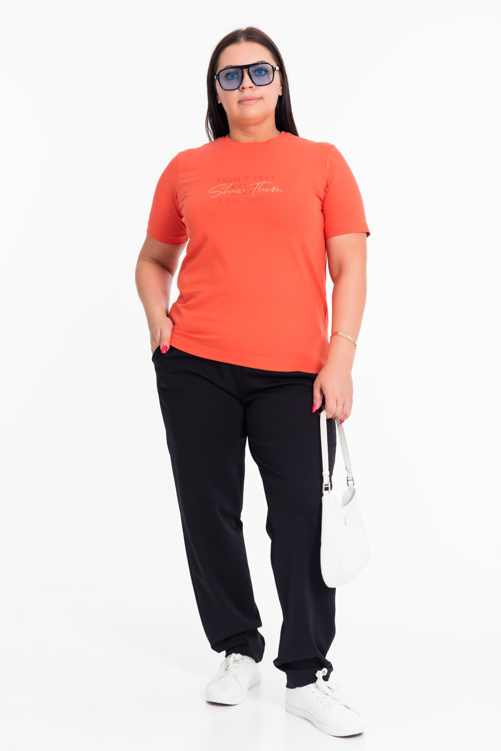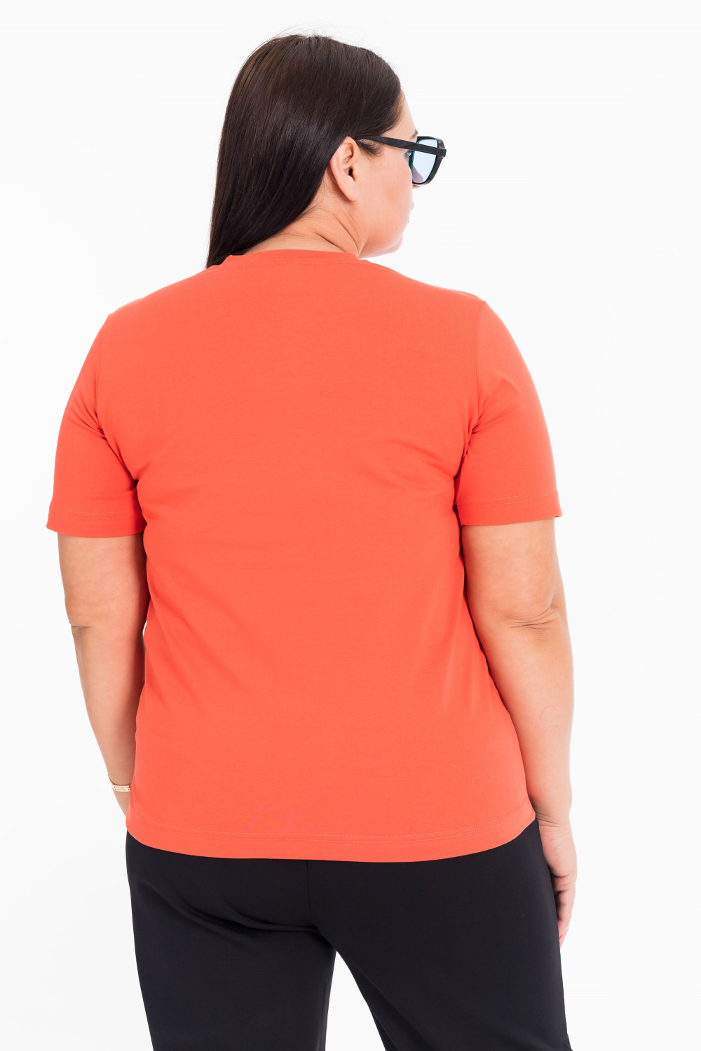 Футболка женская выполнена из хлопка с добавлением лайкры. С круглым вырезом горловины, коротким втачным рукавом и принтом спереди.