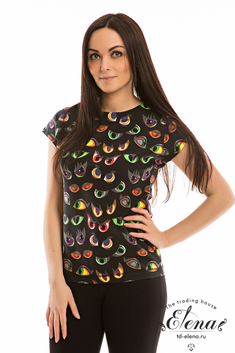 Футболка с коротким рукавом выполнена из кулирного полотна с лайкрой. Сзади вырез горловины обработан бейкой, спереди обтачной планкой.