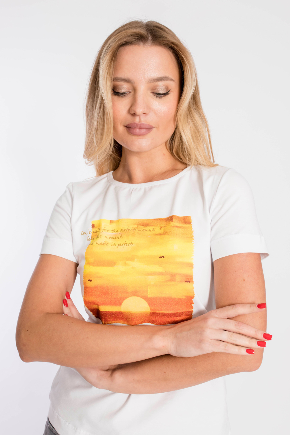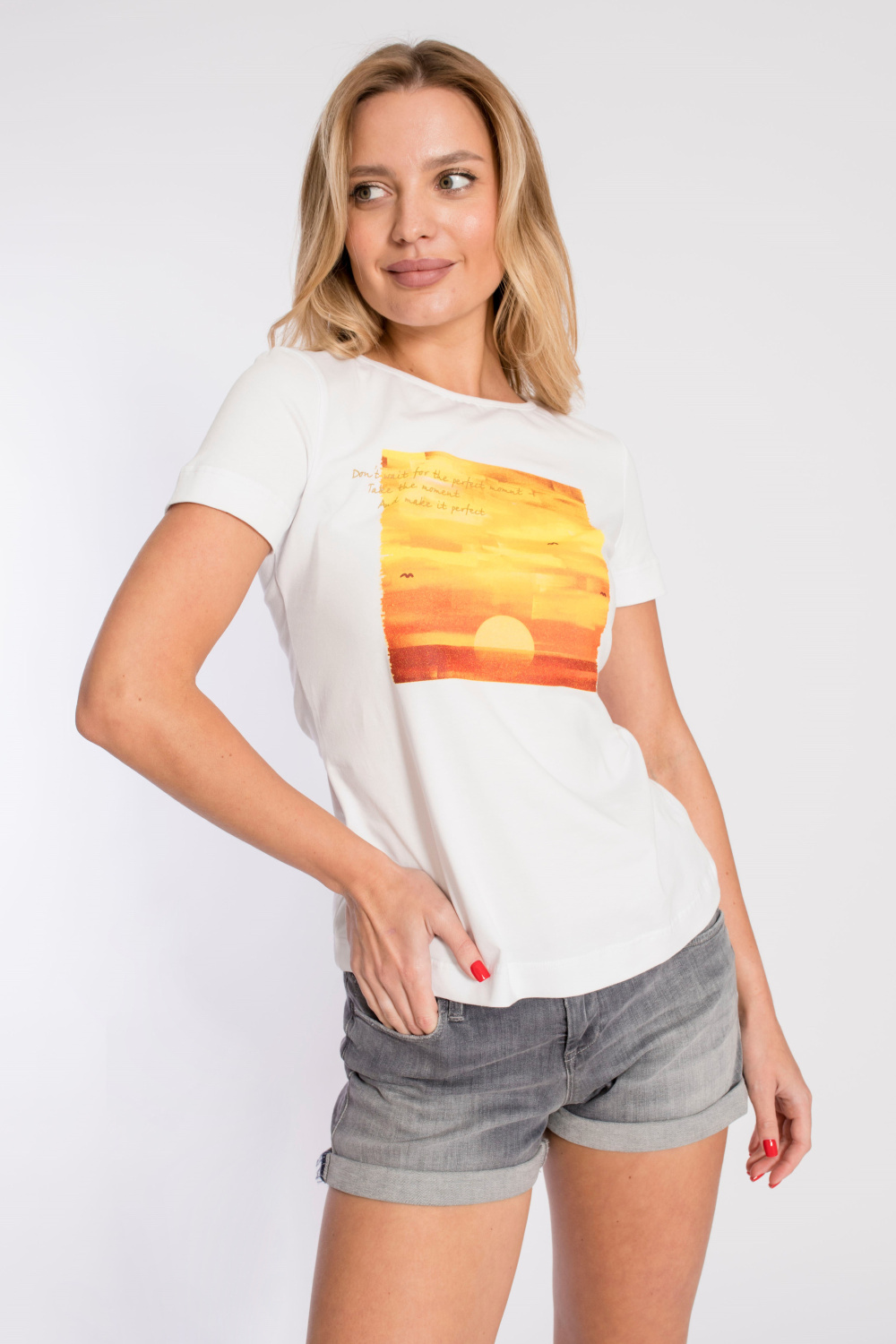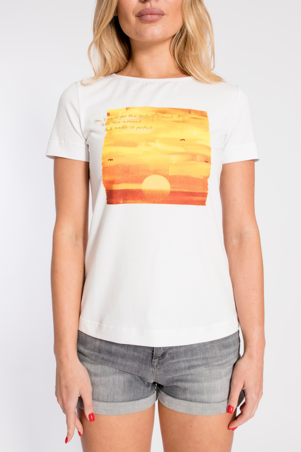 Футболка выполнена из х/б полотна с лайкрой. Вырез горловины округлый, рукава короткие. Спереди нанесён принт.