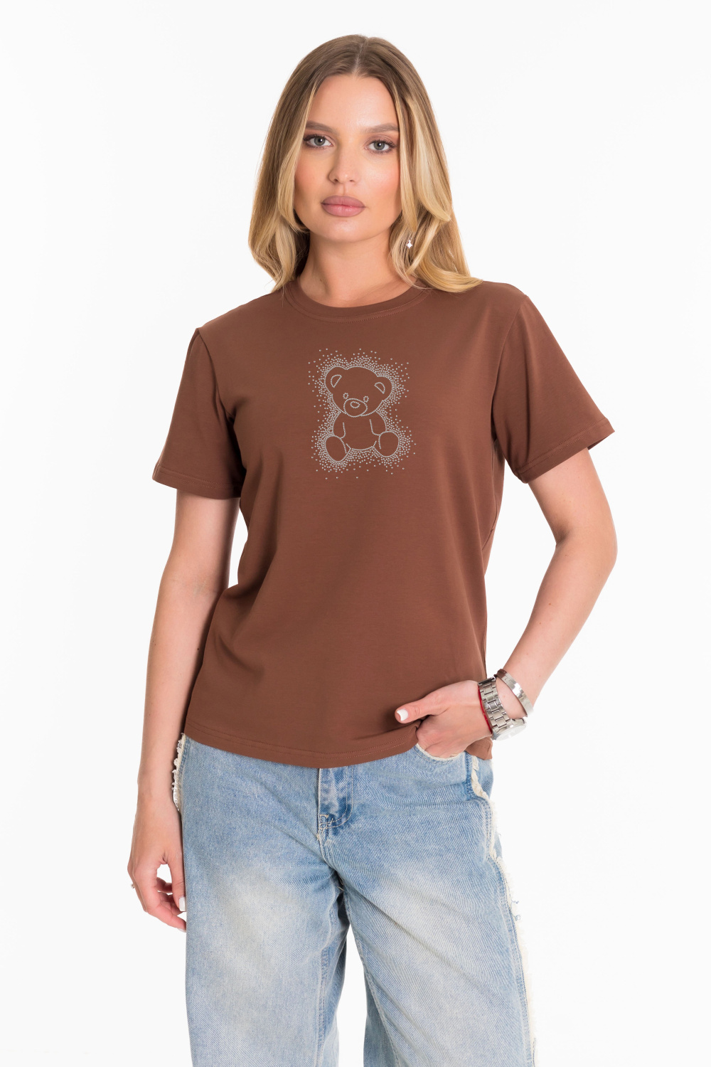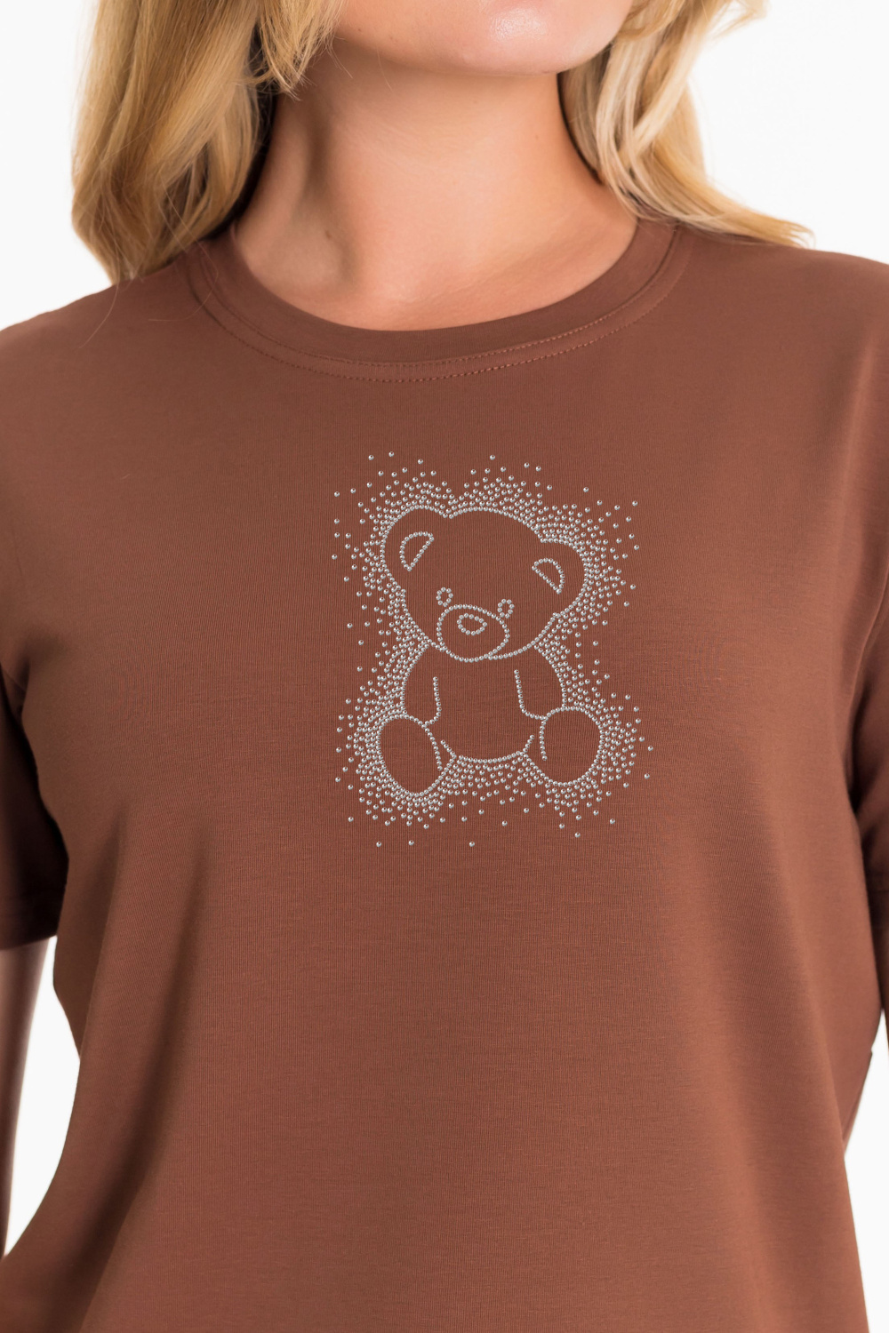 Женская футболка с принтом спереди изготовлена из хлопкового полотна с добавлением лайкры. Футболка с коротким втачным рукавом и круглым вырезом горловины, что придает ей классический стильный вид. Такая модель футболки отлично сочетается с джинсами, брюками или юбкой. Изготовленная из натуральной ткани, футболка обеспечит комфорт в течение всего дня.