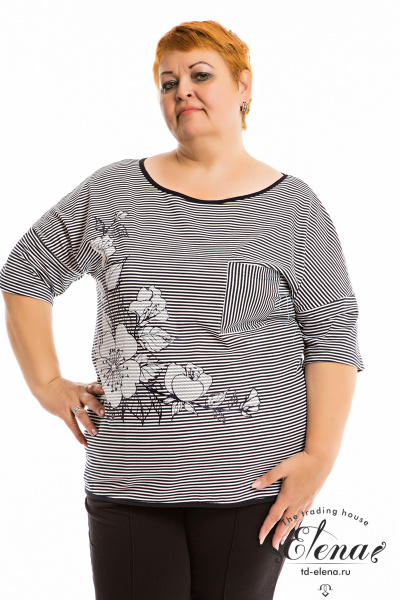 Женская тельняшка с принтом и коротким спущенным рукавом. Спереди расположен карман с вертикальным направлением полоски. Горловина и низ тельняшки обработаны однотонной отделочной бейкой.