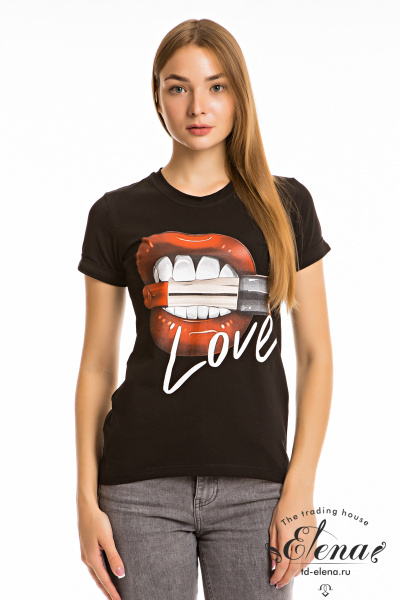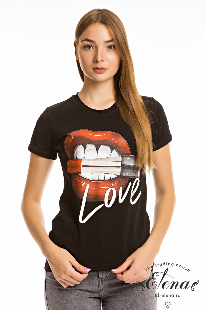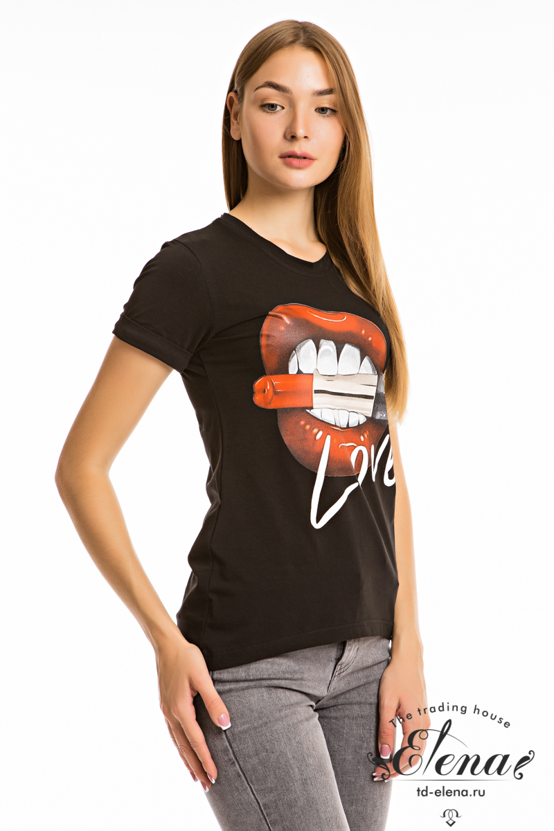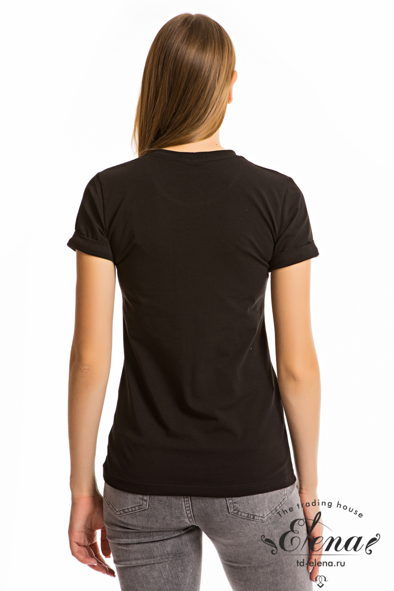 Футболка выполнена из кулирки с лайкрой. С коротким втачным рукавом с отложной манжетой. Круглая горловина с притачной планкой, спереди нанесён принт. Низ футболки разноуровневый.