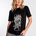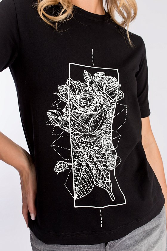 Футболка из кулирки с лайкрой с коротким втачным рукавом. Силуэт полуприлегающий, круглый вырез горловины оформлен притачной планкой. Спереди нанесён принт.