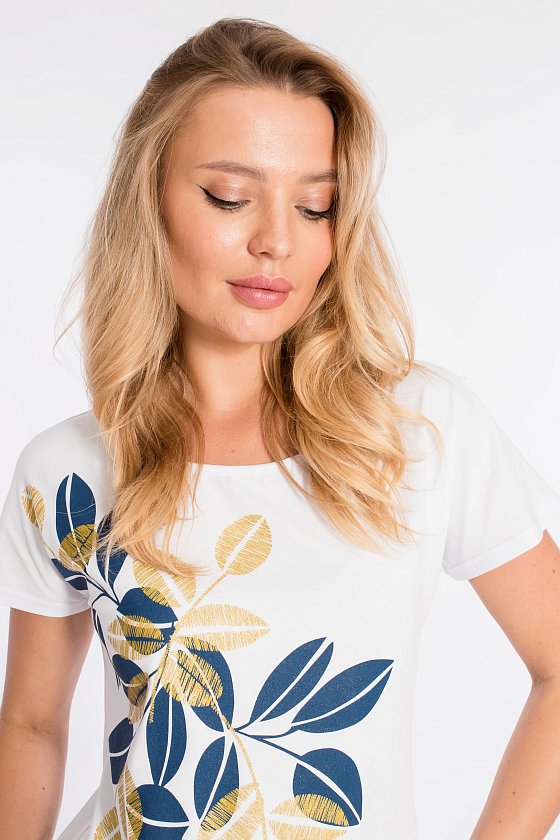 Футболка с цельнокроеным рукавом выполнена из хлопкового полотна с лайкрой. Горловина обработана бейкой. Спереди нанесён оригинальный принт.