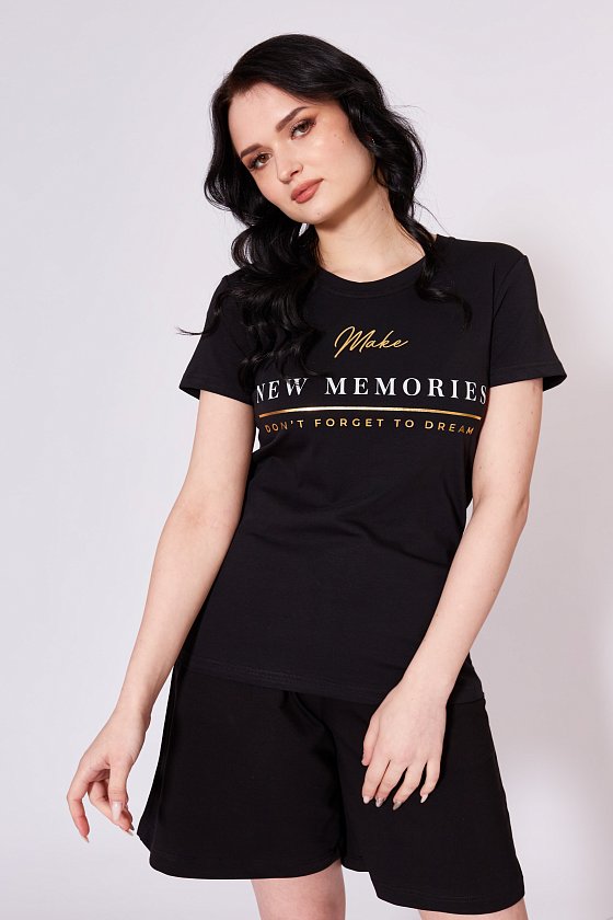 Футболка из кулирки с лайкрой с коротким втачным рукавом. Круглый вырез горловины с притачной планкой. Спереди нанесён принт.
